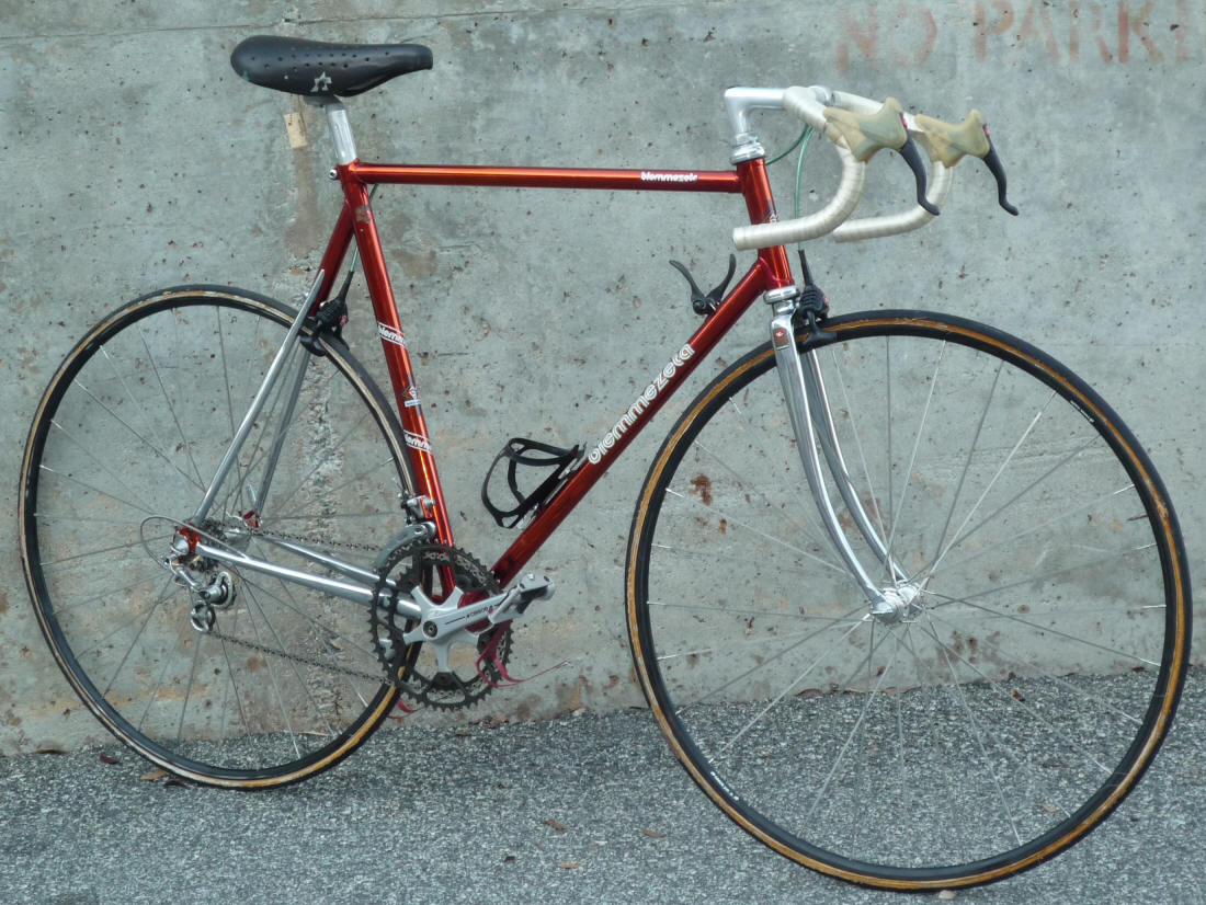 der Vollständigkeit halber noch ein paar Bilder (m)eines lupenreinen, aber ziemlich runtergerittenen BMZ-MILANETTI, das ich gerade in der Kur habe. Kam mit kompletter Dura Ace-Ausstattung zu mir und ich habe mich sofort verliebt. Leider ist es zu groß für mich. Mal sehen ...
