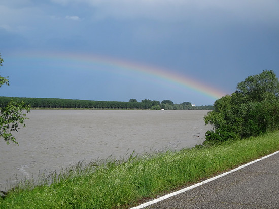 Die letzten hundert Kilometer führten uns auf den Damm des Po, der Radweg dort war zum Teil voller Schlaglöcher und die „Kontaktflächen“ zum Rad litten entsprechend. Wir fuhren direkt auf eine Gewitterfront zu und hatten mit üblen Gegen- und Seitenwind zu kämpfen. Zum Glück hatte ich den Angstbrmsr dabei, hinter dem ich mich, so gut es ging, zu verstecken versuchte.
