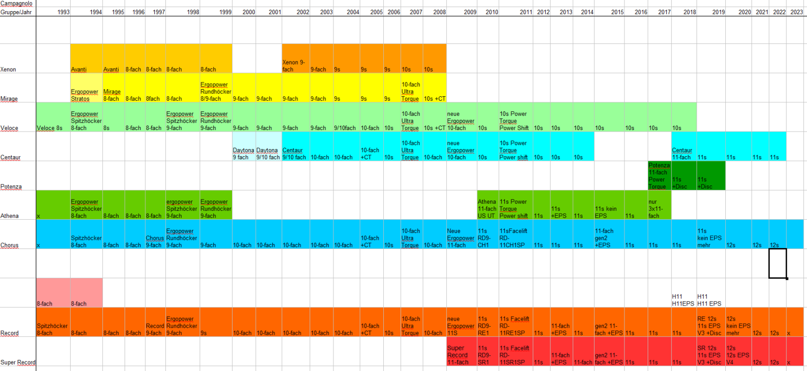 Ich bin grade dabei eine Zeitlinie für Campagnolo Gruppen zu erstellen.