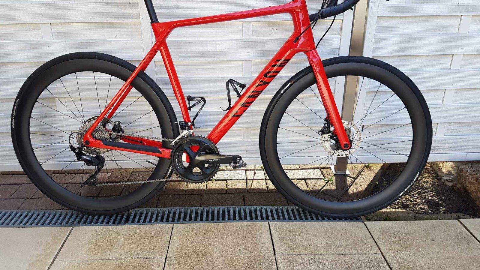 Ein Hauch weniger wendig und verspielt, so wie man es vom Rennrad her kennt. Option bis 35mm (offiziell). Dann ist noch 5mm Platz rechts und links (mit Messschieber selbst gemessen). Ein Hauch weniger spritzig. Das mag am Felgensatz liegen (1644gr) und daran dass das CF 7 etwas schwerer ist als man es gewohnt ist (auf dem Bild 8,4kg fahrfertig mit Pedale und Halter). Am Berg merkt man das. Außerdem sitzt man etwas aufrechter. Das kann man natürlich alles ändern, aber es soll bewußt low budget sein. Der Lenker ist mit 440mm etwas breit, soll aber dem Allroad zuträglicher sein. Mir wären 400mm lieber, paßt dann aber nicht mehr zum ursprünglichen Konzept von Canyon. Also alles in allem eher ein ruhigeres RR und kein Vergleich zu einem Aeroad oder Ultimate. Das merkt man schon sehr schnell wenn man zwischen den Rädern wechselt. Wer es nicht eilig hat und keine Berg KOM holen möchte, auch mal schnell zwischen Gravel und RR wechseln möchte, wobei die Verschiebung ganz klar mehr Richtung RR geht, ist mit dem CF 7/8 sehr gut bedient. Dazu die 400 Euro DXC und man hat eine optisch schönes und praktisches RR. Wer nur Vollgas brezeln will, sollte direkt zum Ultimate greifen.
