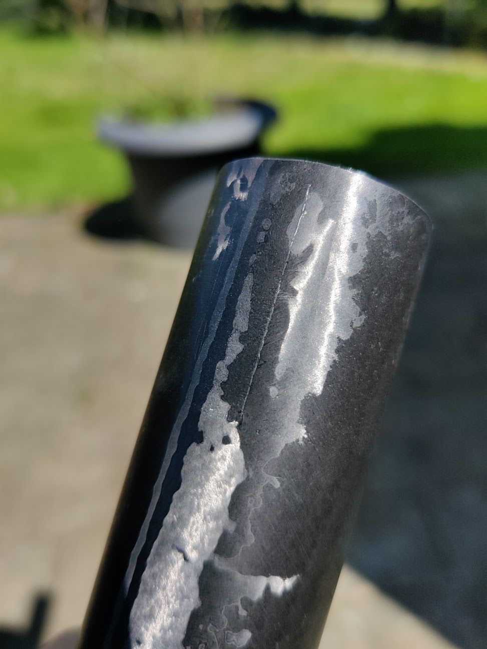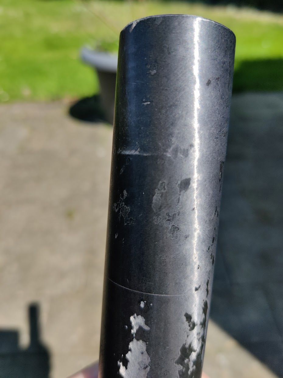 Nun habe ich einen vertikalen "Schlitz" bzw. Abdruck an der Schaftoberfläche, der mir allerdings gar keine Sorgen bereitet, das lag an einem nicht ordentlich entgrateten Vorbau, der seine Spuren hinterlassen hat. Die Stelle kannte ich bereits, der Vorbau ist mittlerweile ordentlich entgratet und alles ist gut, hier liegt ein langer Expander hinter und da kann eigentlich nichts passieren, da vertikal.