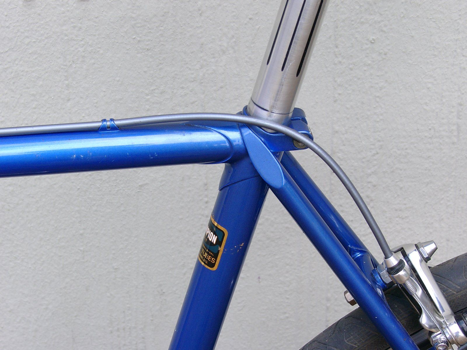 In der Tat, da habe ich eben nicht genau hingesehen: Die Klemmung und die Strebenanlegung haben sich bei Pro offenbar in den frühen 1980ern geändert. Bei meinem Pro (und dem oben von @knutson22 gezeigten) sieht das noch so aus:Ein Semipro habe ich auch, das ist auch ein spätes 81er Modell, keine Unterverchromung, keine Löcher in den Muffenspitzen, keine im Tretlagergehäuse, aber gleiche fette Sattelklemmmuffe. Rahmen ist sogar 100g leichter als der rote Pro. Und es passen 30mm Reifen rein...