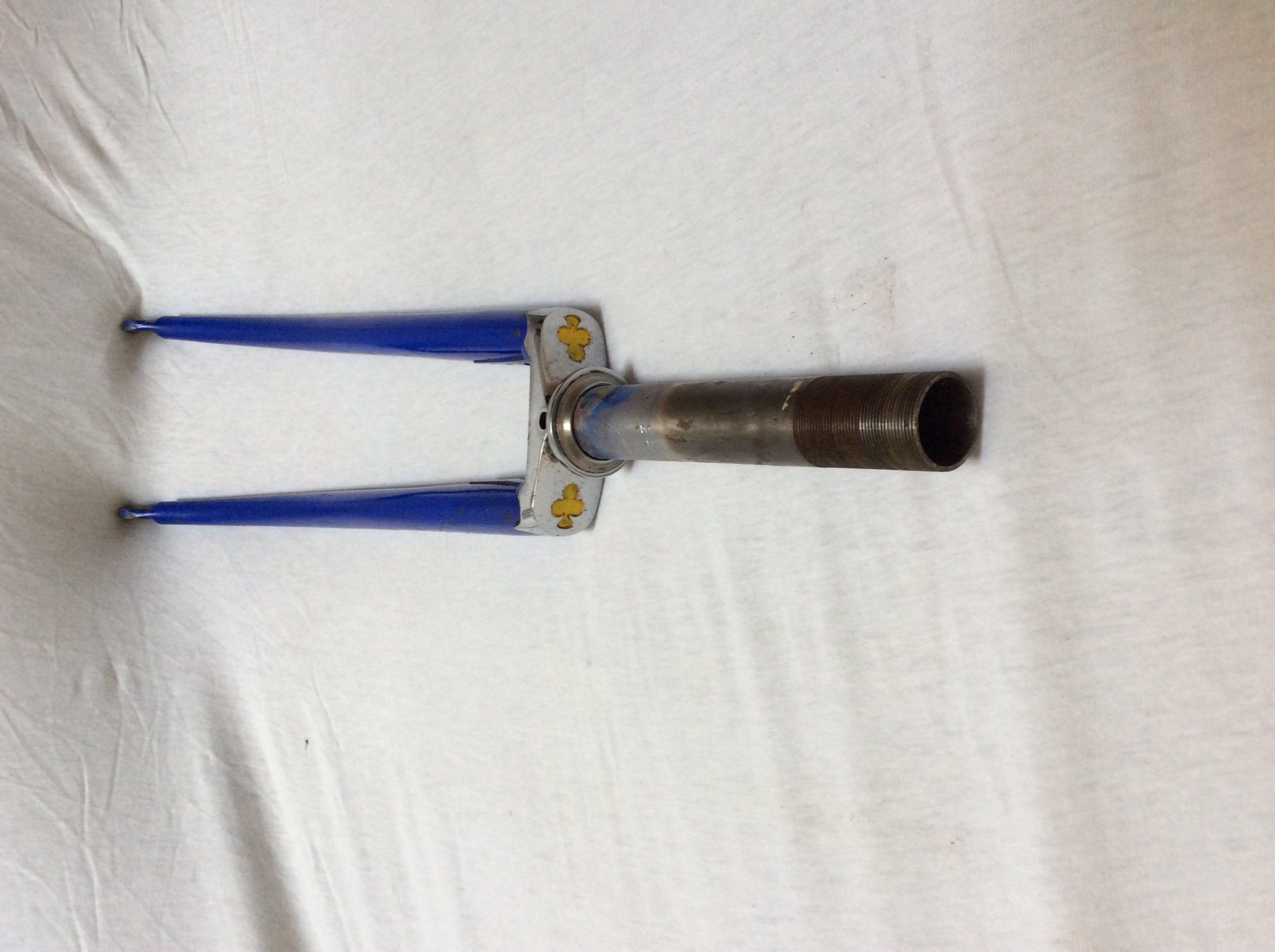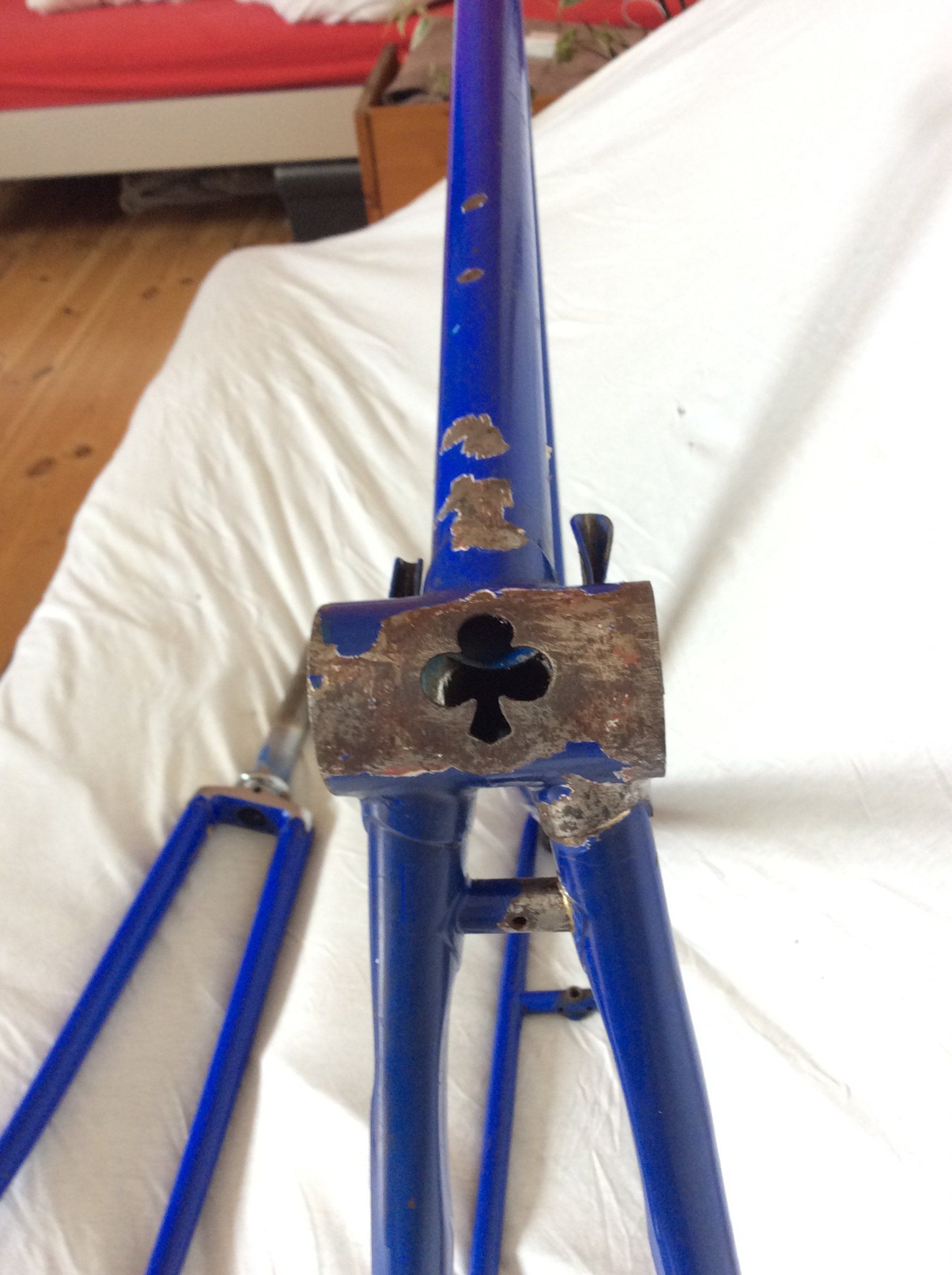 Habe mich mal an die ersten groben Roststellen gesetzt: die verchromte Gabelkrone ist glaube kein Thema, das geht sehr gut mit Polieren weg (reines Baumwolltuch, ein bisschen WD-40). Am Tretlager ist`s schon harziger, denke aber, das bekommt man auch hin. Der Rost scheint sich zumindest noch nicht durchgefressen zu haben, sondern noch recht oberflächig zu sein.