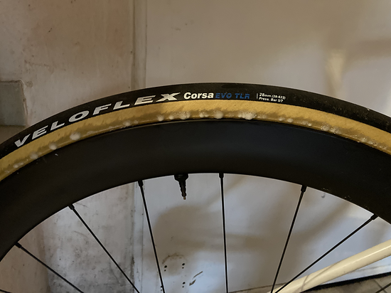 Der Veloflex ist mein erster Tubeless Reifen, dessen Flanke ich nicht dicht bekomme. Da kommen permanent Blasen raus, die die beige Flanke versauen. Schade…