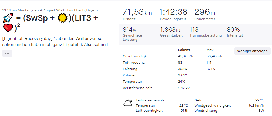 Die Intervalle waren bei 114% FTP. Das war aua! Aber ich denke ich muss meine FTP nach oben korrigieren, obwohl der Test noch gar nicht so lange her ist. Ich bin ja ein Dieseltyp. ... Aber ja, ich verstehe schon... nun weißt du immer noch nicht, wie lange meine Kurbel ist. :p