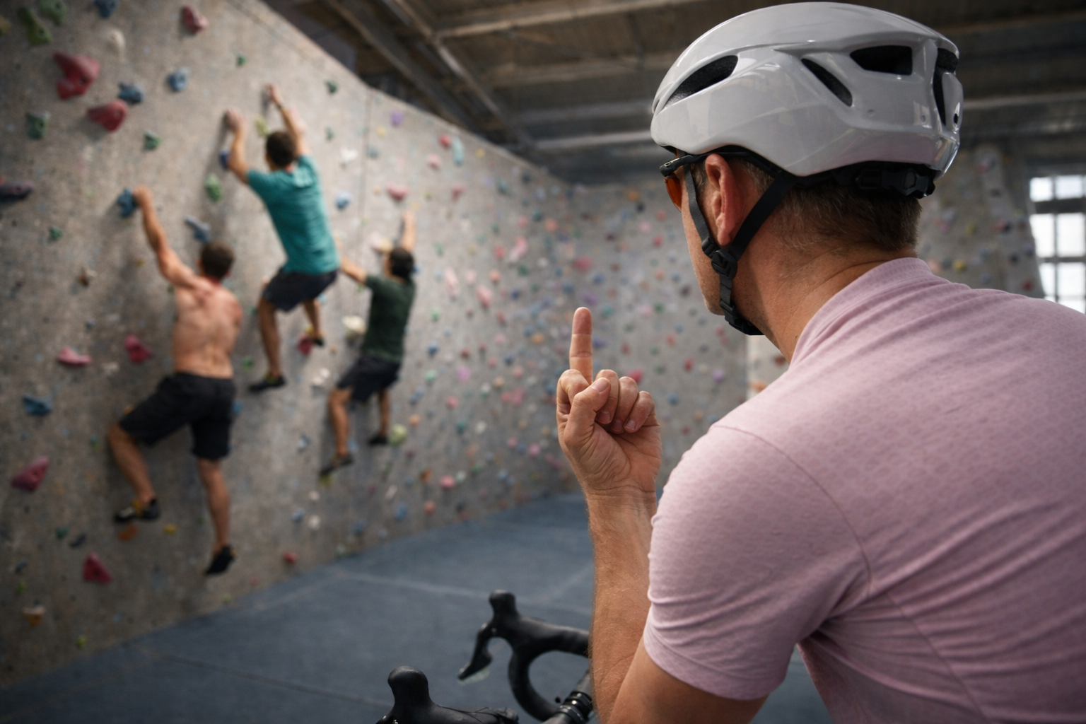 die Mutti, die vor dem Portugal-Urlaub vielleicht 3–4-mal in ihrem Leben mit den Kids bouldern war, seitdem* nicht mehr … und dazu ein Kletterlehrer, der auch wettkampforientiert bouldert 🫠