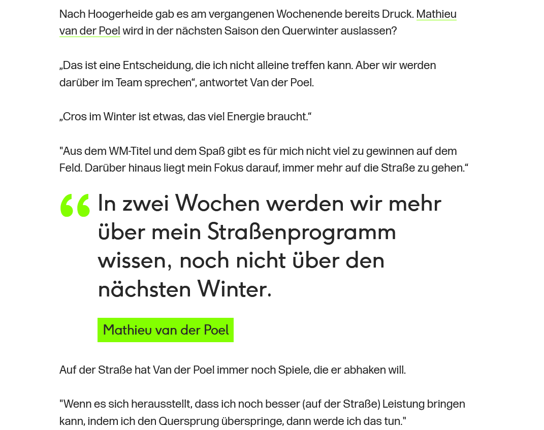 Ist vielleicht gar nicht so doof. Die Kombi hat zwar letztes Jahr gut funktioniert, aber wenn man immer nur das gleiche macht, wird man auf Dauer auch nicht besser. Schadet sicher nicht, da mal etwas Abwechslung rein zu bringen.Die Übersetzung meint, dass van der Poel eventuell den/die nächsten Crosswinter auslässt, wenn er dadurch besser auf der Straße wird.