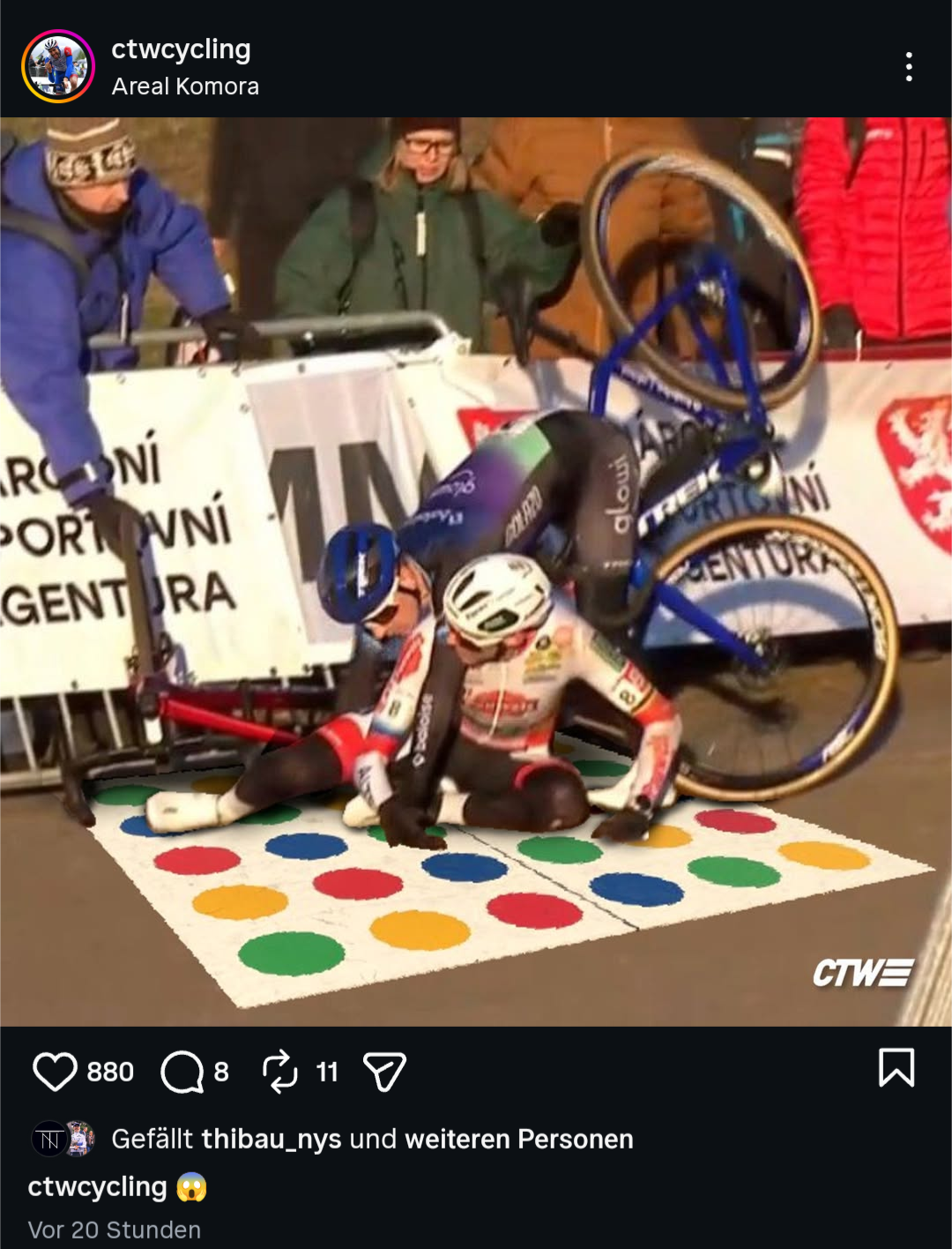 Es sah eher so aus als ob seine kurze Hose einen weiss-rose-roten Beinabschluss hatte?Im Männerfeld war auch rel. weit vorne ein Fahrer der quasi mit langen Socken unterwegs war weil seine Beinlinge fast ganz runter waren. Müsste nochmal schauen wer, aber das war def. kein Einzelfall.