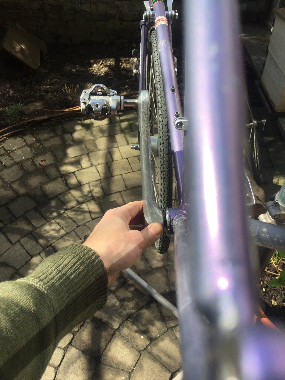 Wie vorher beschrieben ist nicht nur der Rahmen schief, aber auch das Hinterrad. Mit der "Yoghurtbecher-Trick" (danke für den Reminder @Mischief ) habe ich al nachgeschaut wie schlimm es denn wohl ist … und es ist schlimm.