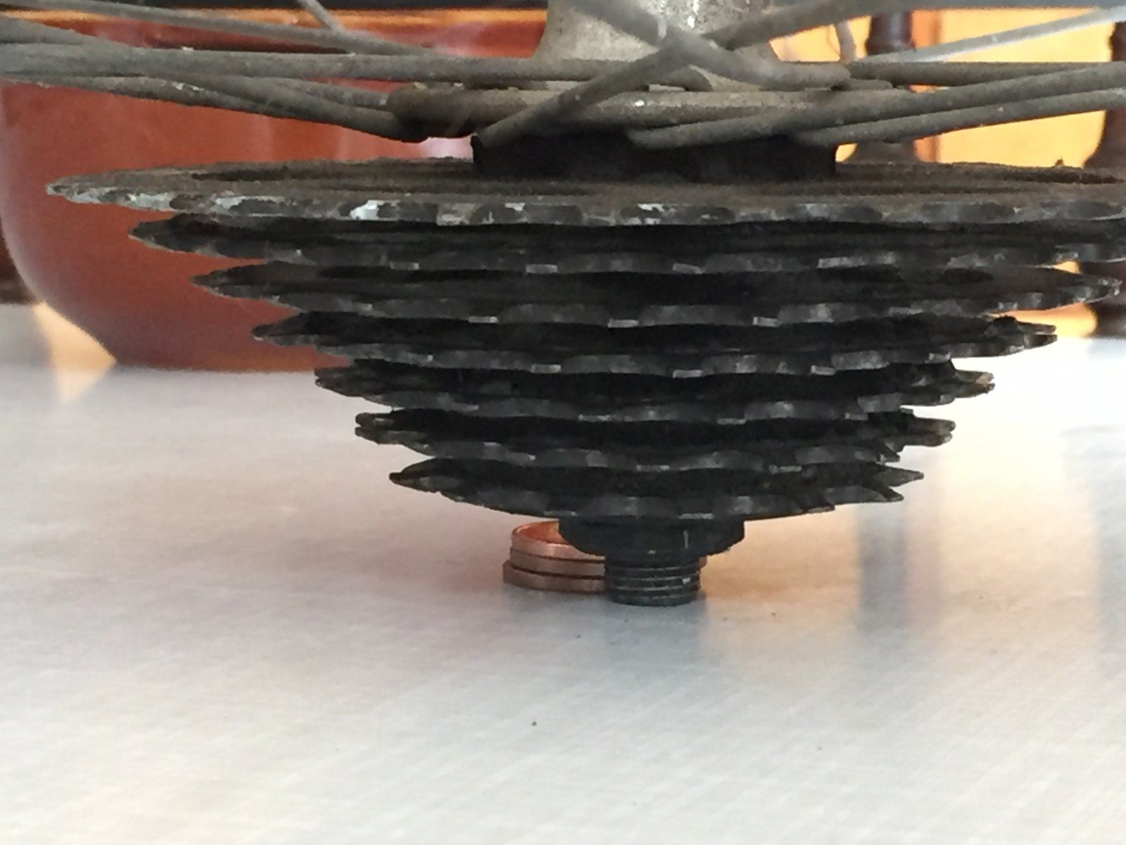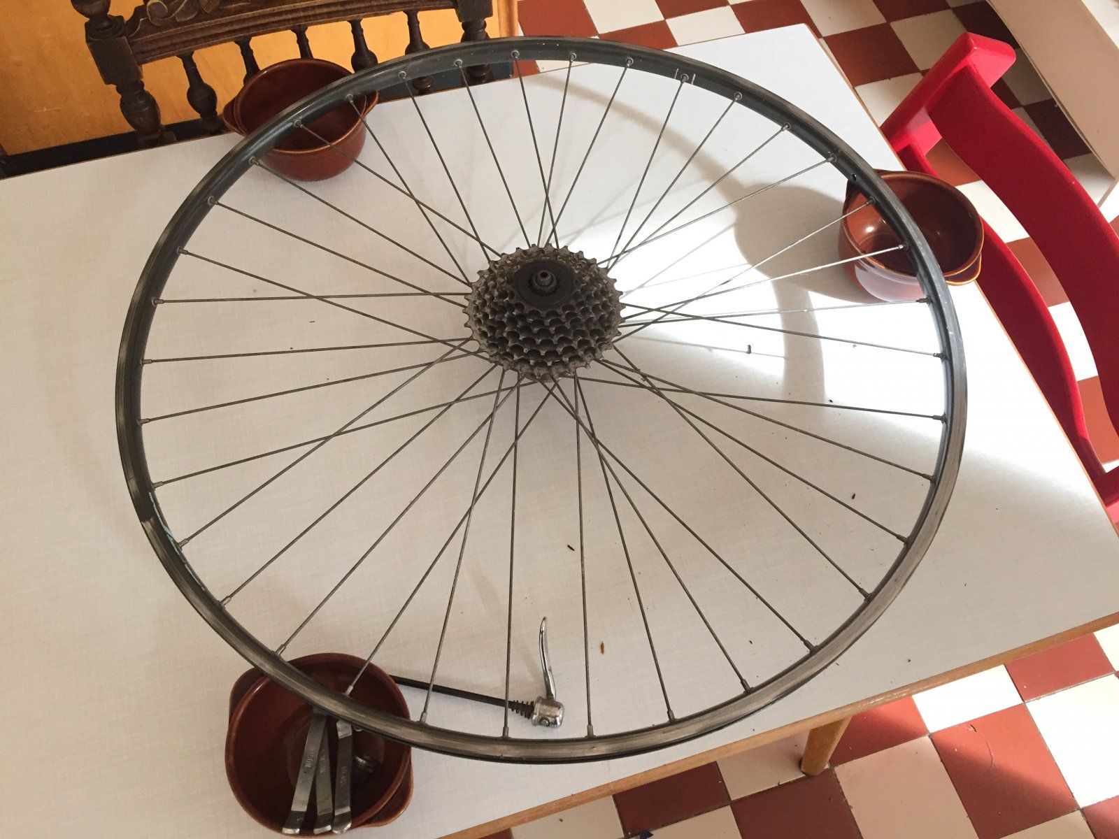 Also, Reifen und Schlauch runter, Schnellspanner raus und drei Schüssel auf dem Tisch aufgestellt. Hinterrad oben auf die Schüsseln drauf und dann mal gucken …