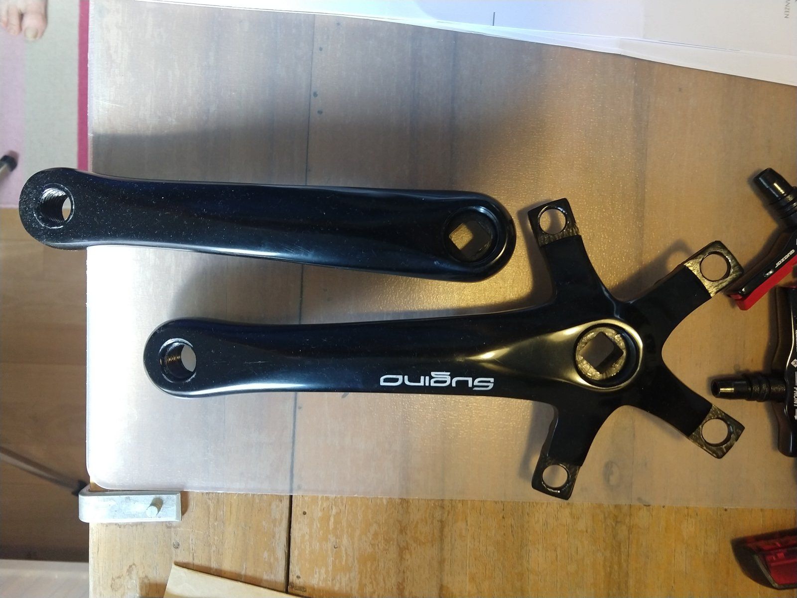 Die Lagerschale wurde bei einem Hebelversuch etwas deformiert, der Abzieher lässt sich aber noch ansetzten. Die Achse sieht unbeschädigt aus. Jetzt kann ich diese schöne 165mm-Suginokurbel anbauen: