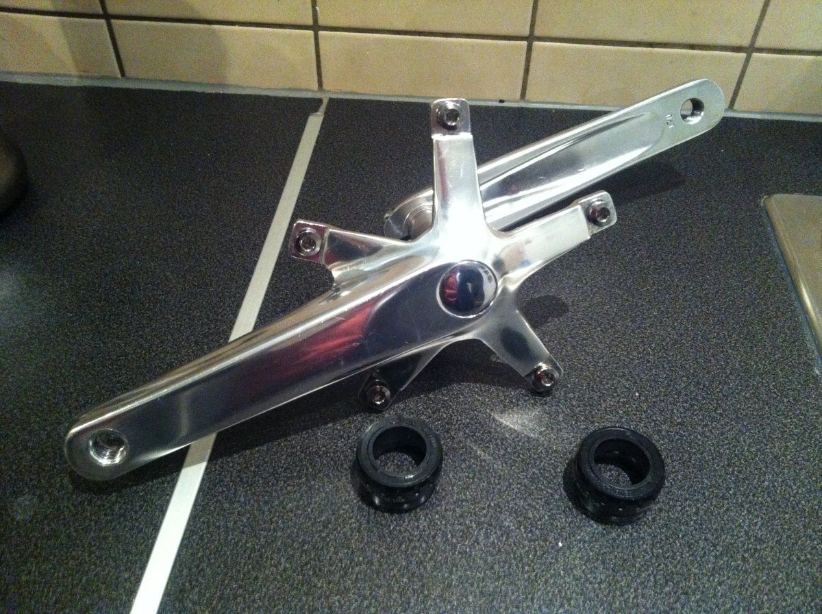 Andel Kurbel mit Außenliegenden Lagerschalen (Dura Ace) und Kettenblattschrauben.
