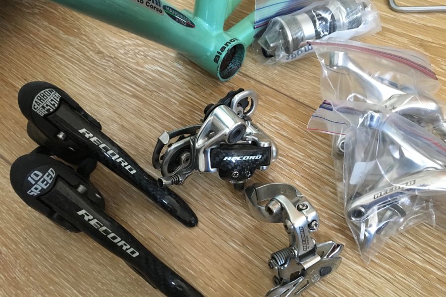 Fertig! Ja, keine Super Record und auch noch mit Cinelli! Wurde als Rahmenset gekauft und mit Dura Ace aufgebaut. Jetzt meine Version einer möglichen 87er Specialissima. Leder ist etwas dunkel. Lack etwas ausgeblichen, was die Decals leider nicht so gut verkraftet haben (Alle sonstigen Aufkleber sind gut mit der Sonne klar gekommen, seltsam). Flasche extrem ausgeblichen und so porös, daß sie bloß noch als Deco dienlich ist. Züge passen zum Lack, Pumpe hat wiederum den Farbton des Leders. Alles zusammen ergibt Celeste. Ach so: orig. Decals für das Sattelrohr habe ich noch, leider keine für das Unterrohr!