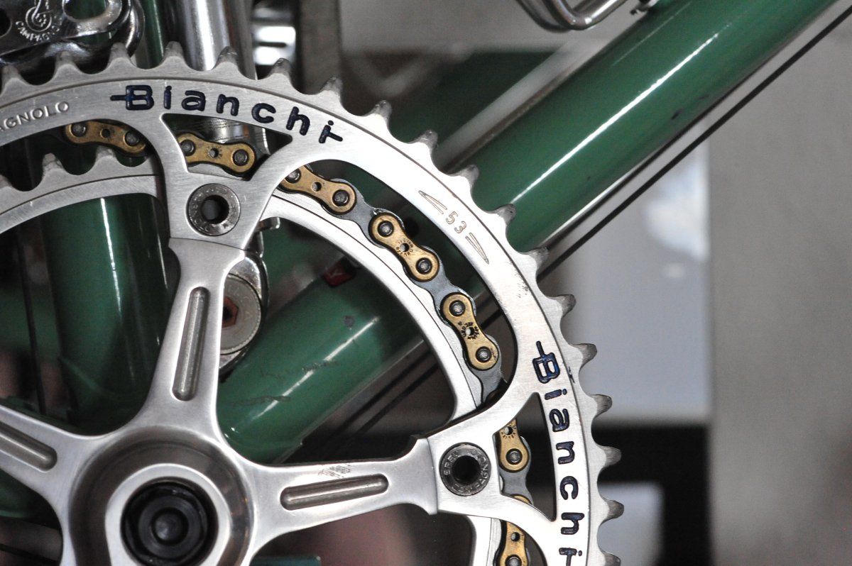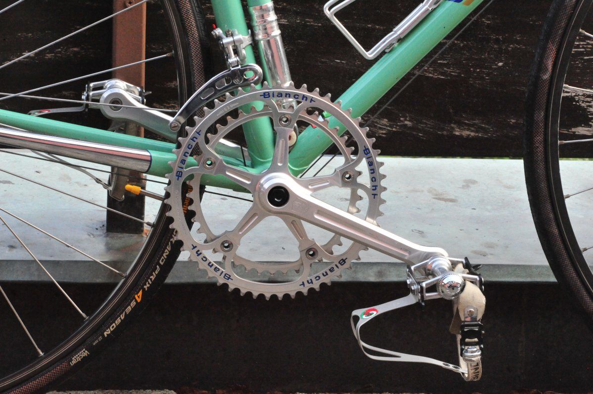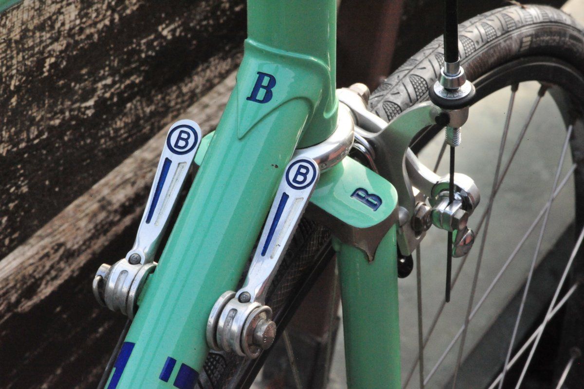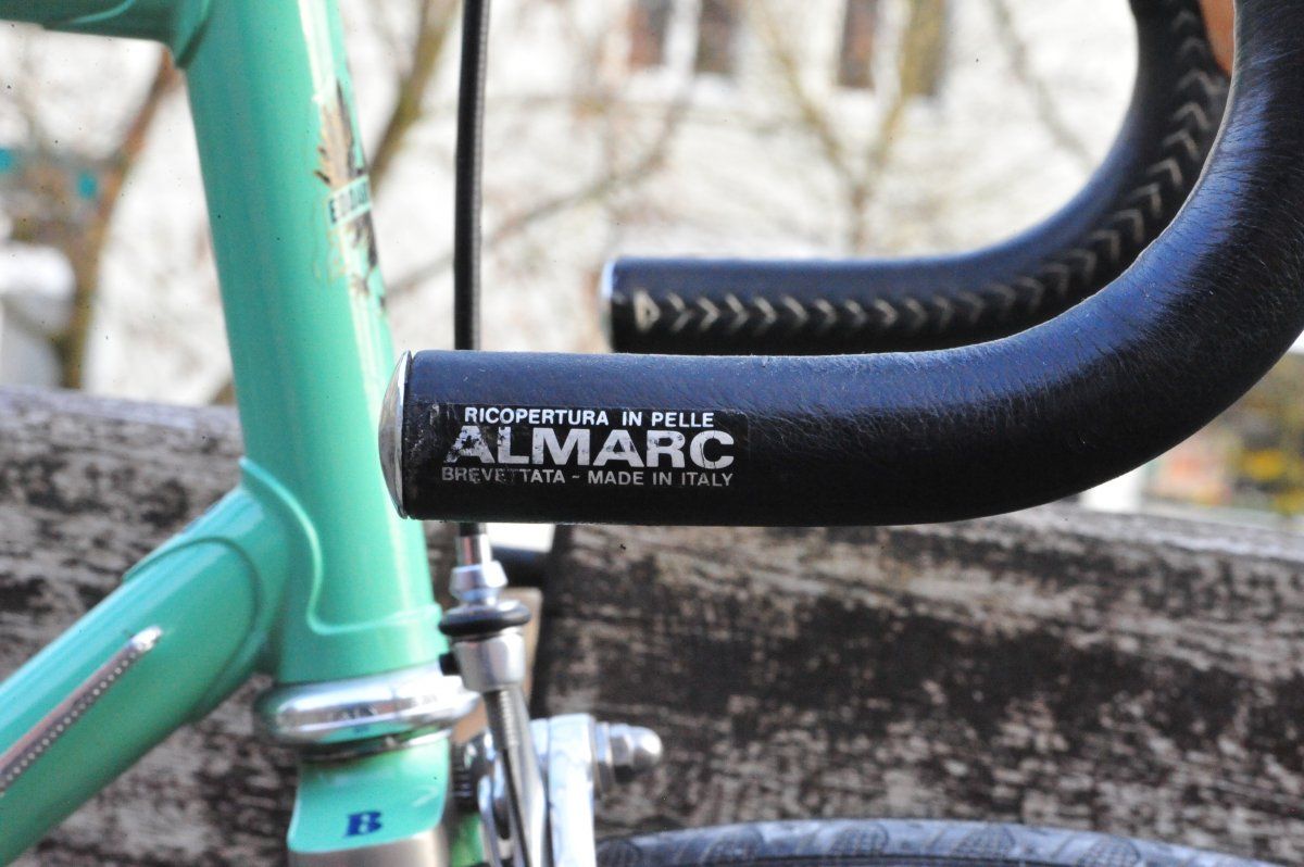 Schöne Bremshebels.Das wird mein Rad, mit dem ich dieses Jahr immer zur Arbeit fahren werde. Es ist ein Bianchi Specialissima Super Leggera. Das Rad kommt aus Kalifornien und laut dem Erstbesitzer wurde es mit MA40 Felgen ausgeliefert. Ich habe aus gewichtsgründen das Innenlager gegen ein OMAS Titan ausgetauscht und einen Campagnolo Super Record Alu Kranz montiert. Die Pedale wurde auch gegen Super Record Pista mit Titanachse getauscht. Da ich viel durch den Wald fahre kommen Continental Grand Prix 4Season mit Conti Supersonic Schläuchen zum EInsatz. Damit es komplett ist, werde ich jetzt noch die Regina Extra Record ORO montieren.