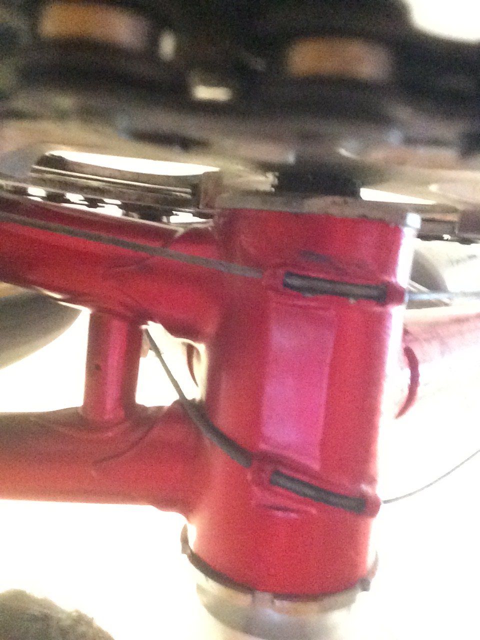 Wie komme ich darauf? Ich denke da sollten zwei dreivierteloffene Röhrchen angelötet sein, so wie im nachstehenden Bild gezeigt (geliehen von oppi-oppi). Im Bereich 80-86 haben alle, bei denen ich bislang unter'n Rock geguckt habe, diese Röhrchen genau so. Zudem würde ich bei einem frühen 79 die Zugführung über'm Tretlager erwarten - Meinungen dazu?