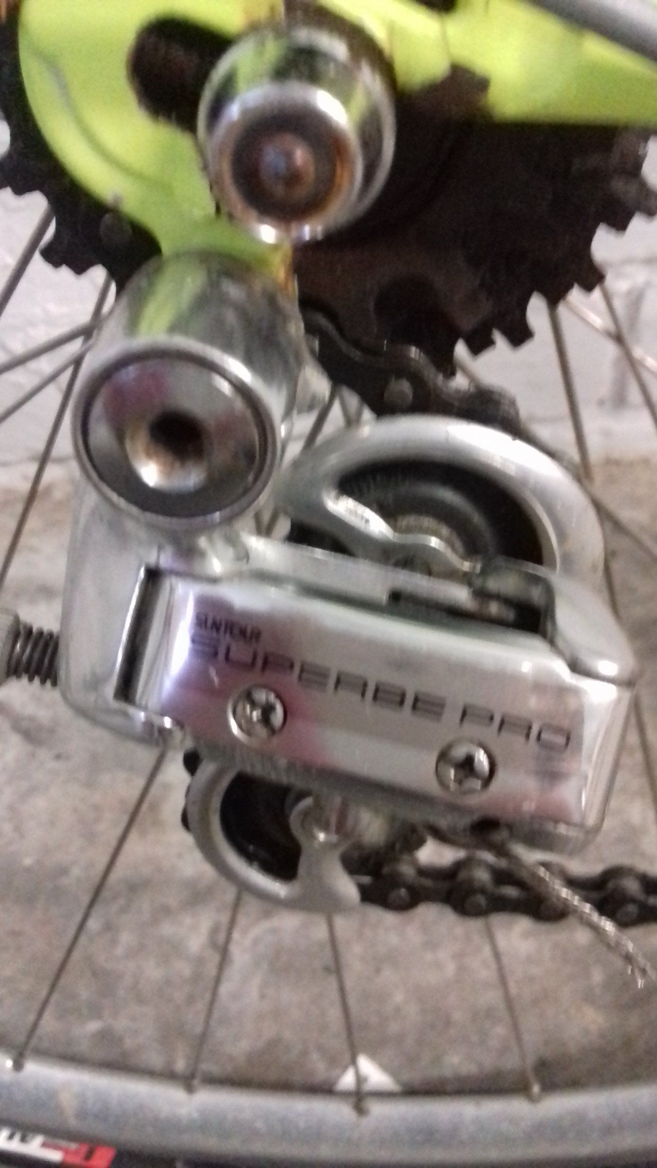 Bei der Schaltung ist hinten eine Prägung "Pat XX", wobei die Platzhalter die Jahreszahl (Baujahr) angeben. Ab 1984 gibts keine Prägung mehr und die Schaltung ist etwas anders aufgebaut (deutlichstes Merkmal: die Parellelogrammfeder ist nicht mehr an einer extra Schraube gehalten, sondern an einem Schaltbolzen - und eben die fehlende Jahreszahl). Beim Umwerfer gibts keine Änderungen, das Außenblech hat 3 Löcher und der Schwenkkörper ist schwarz lackiert, wie die Gelenkbolzen der Schaltung (sonst ist es ein Nuovo Record - ohne Löcher wäre ein Gran Sport).