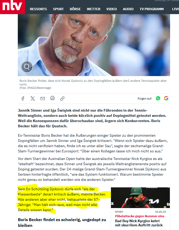 "Boris Becker schimpft über ahnungslose Tennis-Stars", da dachte ich, okay, er meint diejenigen, die ahnungslos sind, dass sie sich mit Testosteron massieren lassen.. aber nein, er meint die kleinen Würstchen unten in der Weltrangliste, die sich erlauben, sich zu äußern. Und überhaupt,