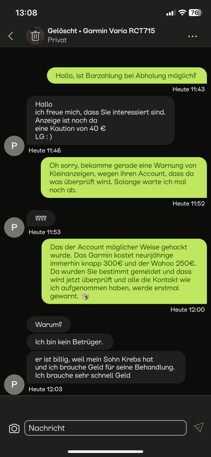 Hab mich mal absichtlich dumm gestellt (fällt mir ja nicht sonderlich schwer😂) aber das ist an Ekelhaftigkeit kaum mehr zu überbieten. Gemeldet hatte ich die Anzeige schon vorher, mich hat nur interessiert was er erzählt, warum er ein Bike Radar welches neu 399€ kostet für 82€ anbietet. Aber so jemand gehört echt 👊