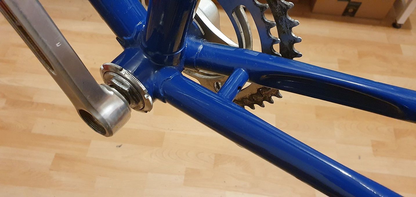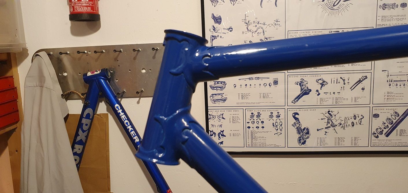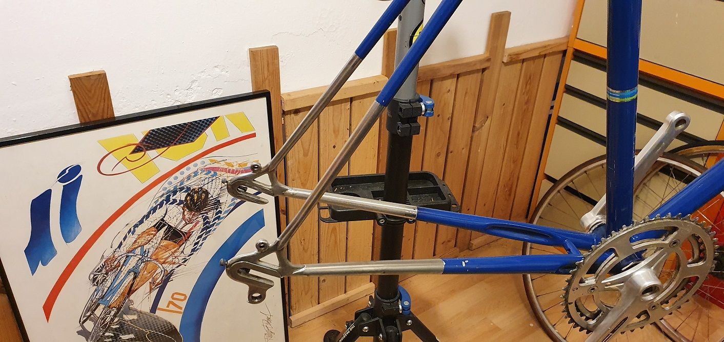 Das Rad bin ich im Original zum letzten Mal 2008 bei einem Triathlon gefahren. Da war der Lack schon stump, das Alu auch, der Rost hatte sich an Pedalen und Schrauben breitgemacht. Corona sei Dank hatte ich dieses Frühjahr etwas Zeit und habe das Rad komplett zerlegt, den Rahmen zum Pulverbeschichten (in Original RAL 4004 Erikaviolett), alle Anbauteile entrostet, das Alu poliert. Sieht jetzt wieder aus wie 1997 und hat meinem Vater glatt eine Träne in den Augenwinkel gezaubert