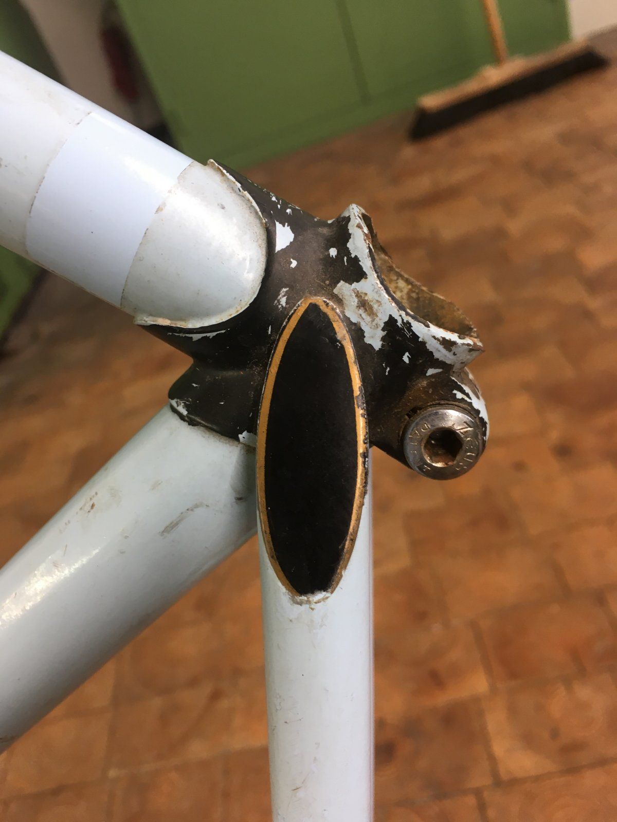 Von Ende der 50er Jahre (so ca. ab 1958) bis ca. 1962 hat Rickert mit Heithus zusammengearbeitet. Der Rahmen ist definitiv von Rickert. Er hat zwar überwiegend Reynolds Rohre verarbeitet, aber in den 60er und 70er Jahren auch ab und zu französisches Geröhr, wenn auch selten. Die Pumpenspitzen waren für Rickert typisch. Dazu kommt die Strebenanlegung wie bei RIC. Die seitliche Zugführung am Oberrohr sieht für mich nach Anfang 60er aus. Schätze den Rahmen auf 1961 oder 1962.Diese Linierungen sind typisch Heithus auch das Boxlining Unterrohr, war Taureau typisch (sieht man weiter vorn auch auf anderen Taureaus). Der Vorbesitzer hat sich auch Mühe gegeben diese zu ummalen und zu erhalten;-)