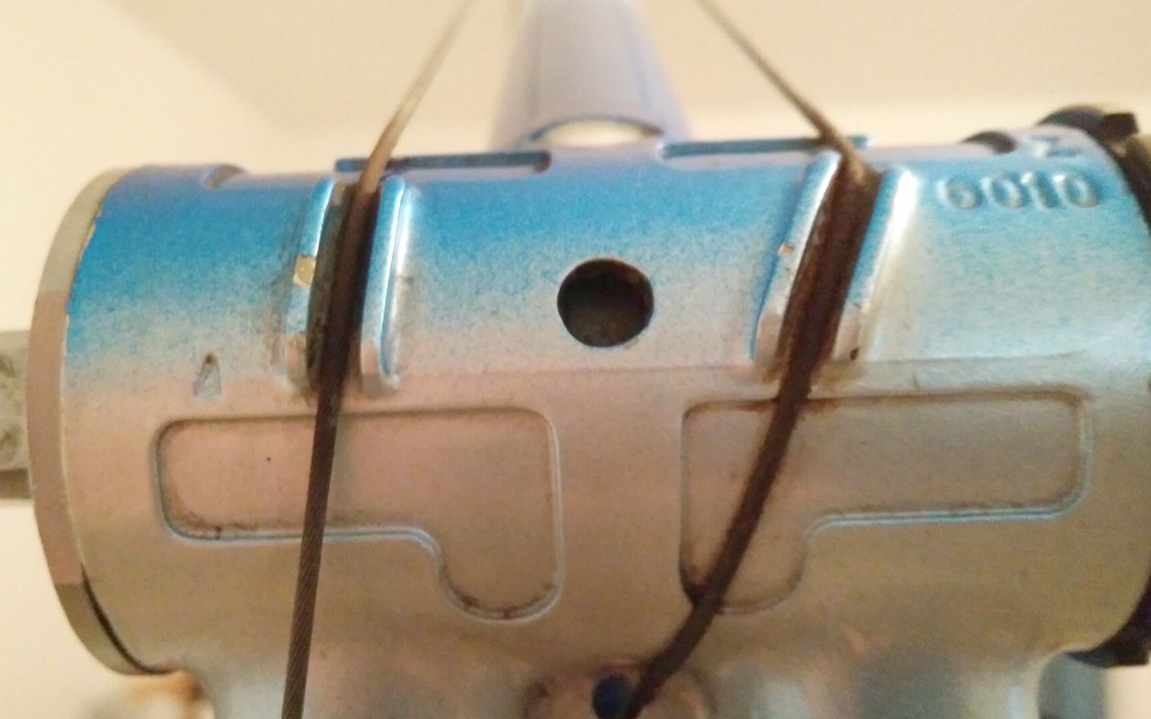 Ein Steuerrohr, ihr habts geahnt. ;) Man beachte auch die zusätzliche Lasche am Oberrohr, da ist auch ein ein Gewinde hineingeschnitten worden. Wofür ist das?