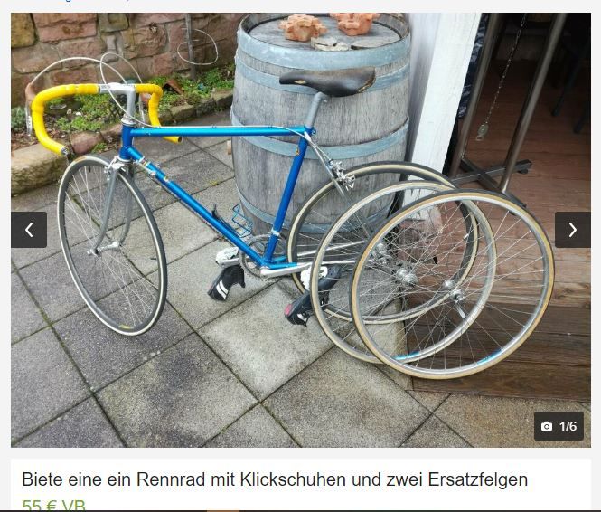 https://www.ebay-kleinanzeigen.de/s...hen-und-zwei-ersatzfelgen/1344325955-217-8746Denke es ist ein "einfacher" Renner mit Shimano 600