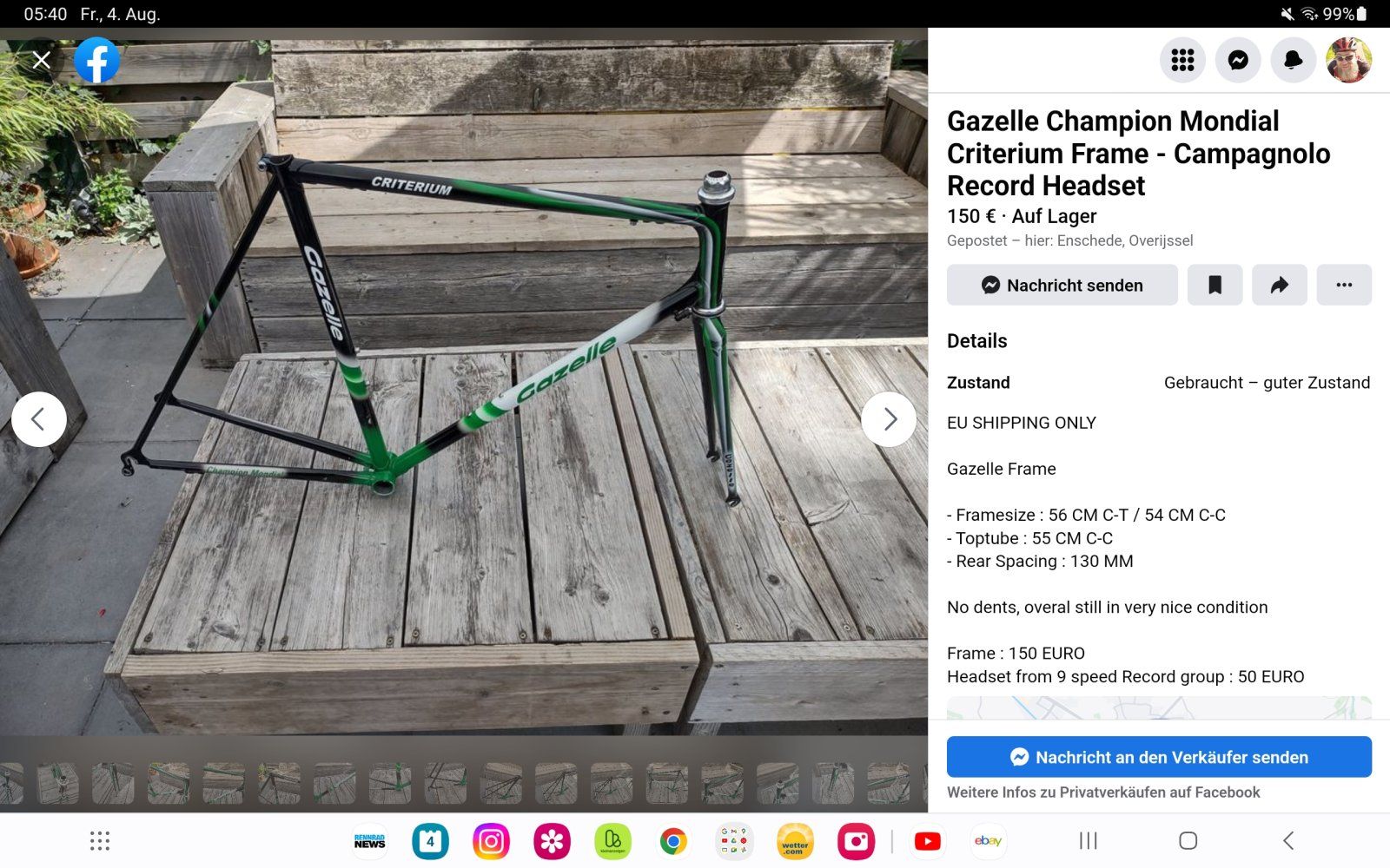 Ein lauer Sommerabend in Altötting. Claus und Rosi haben gerade das zweite Glas Weißwein verköstigt, als sie ihr Tablet anschaltet, um zu schauen, ob schon jemand wegen des Rades geschrieben hat. Über 2000 Ansichten, 132 Nachrichten. "Vintage zieht doch immer" sagt Rosi. "In Vintage veritas" lacht Claus und schiebt hinterher, "Nee, Campagnolo. Es ist immer wegen Campagnolo". Rosi schüttet den beiden nach und murmelt leise vor sich hin, "Ach. Campagnolo". Ihr Blick schweift eine Weile prüfend über das alte Rad, das geduldig in der Abendsonne steht, und meint dann, "Ich glaub' ich behalte das Rad" und löscht die Anzeige. Claus und Rosi stoßen an.