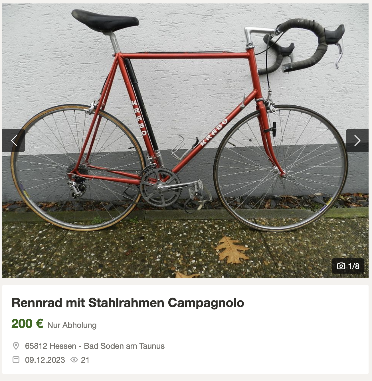 Über das Rad stolper ich immer wieder, alleine die Teile sind die 200 wert.Großes Krabo mit Campa Generationenmix und TA Kurbel. Sieht nach einem guten Deal aus. Unter der Angabe "Für Bastler". Warum, erfährt man aus dem knappen Text jedoch nicht.