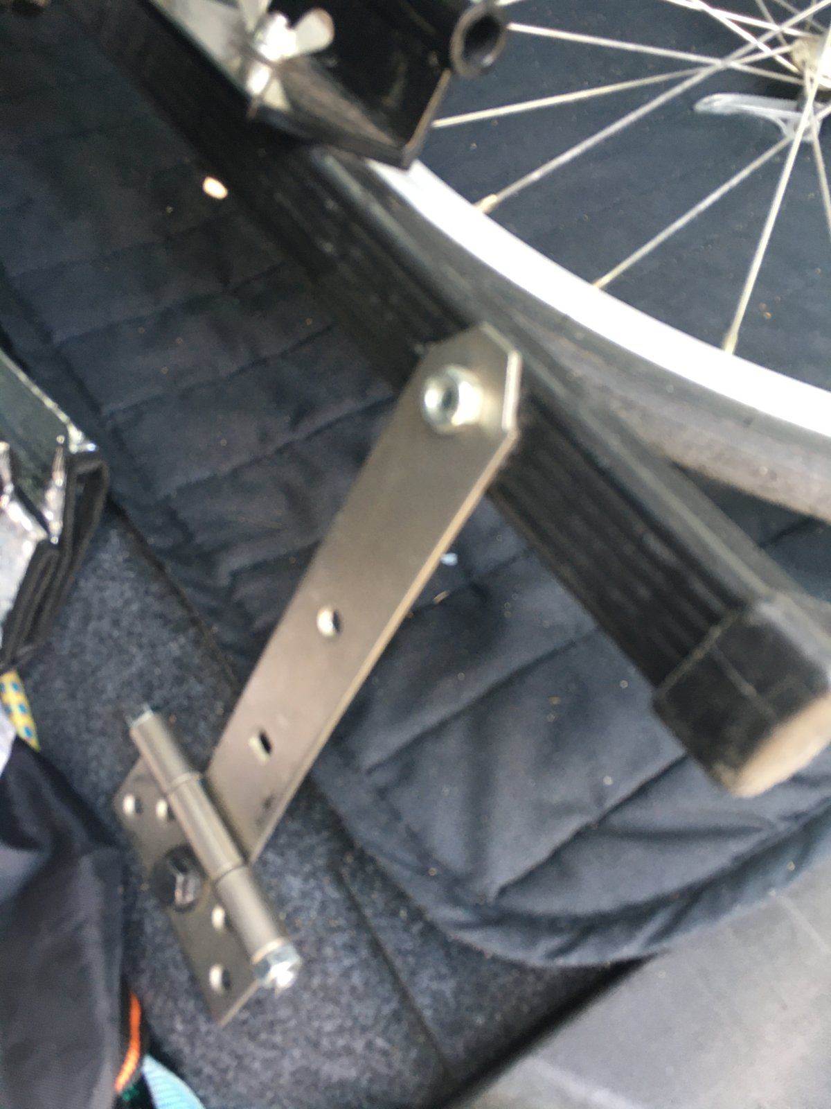 Zwei Türscharniere, eine Lastenträgerstange und zwei Rennradgabelhalter