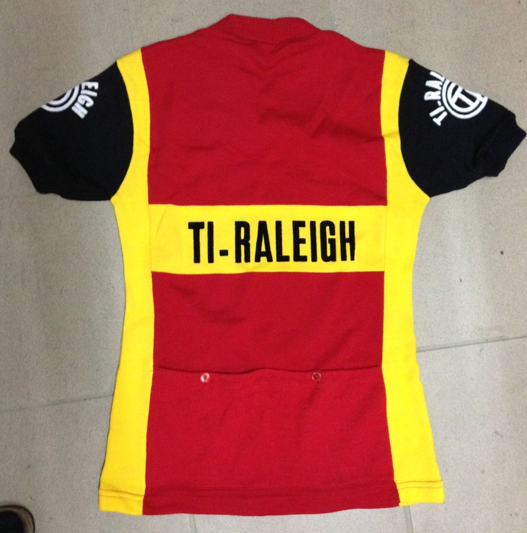Für den stilsicheren Briten-Stahlschwein-Quäler gibt's noch ein TI Raleigh Team Wolltrikot dazu. Der Reisverschluss klemmt ein bisschen - muss Mutti dann ölen oder austauschen.