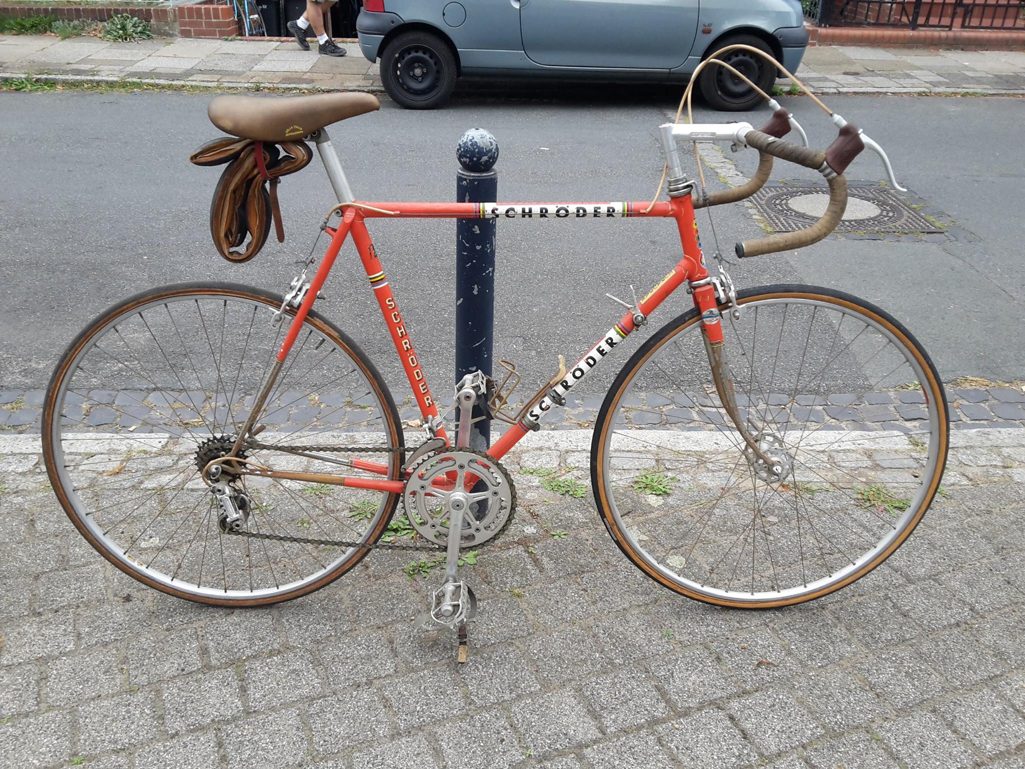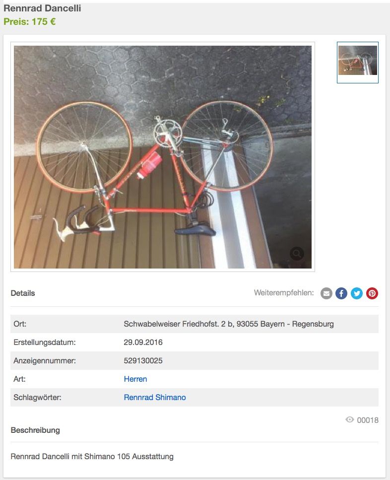 Ein schickes Dancelli, dass scheinbar auch kopfüber fahren kann mit verchromten Muffen (vermutlich komplett unterverchromt) und Shimano 105 für schlappe 175€ in Regensburg: