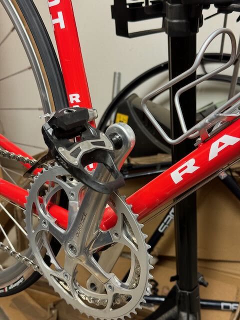 Nachdem der Rahmen Raleigh 853 (Team?) über 1 Jahr an der Wand hing, habe ich beschlossen das Rad entweder aufzubauen oder den Rahmen zu verkaufen. Ziel ist es, das Raleigh, das im Team Golff-Foreldorado gefahren wurde, annähernd an die damals gefahrene Optik hinzubekommen. Da mein Keller allerdings inzwischen von Teilen überquillt (wenn ich dazukomme gibt es im Biete Faden bald einige DA 7400 und 7403 Komponenten zu kaufen), wurde nur benutzt was schon da war