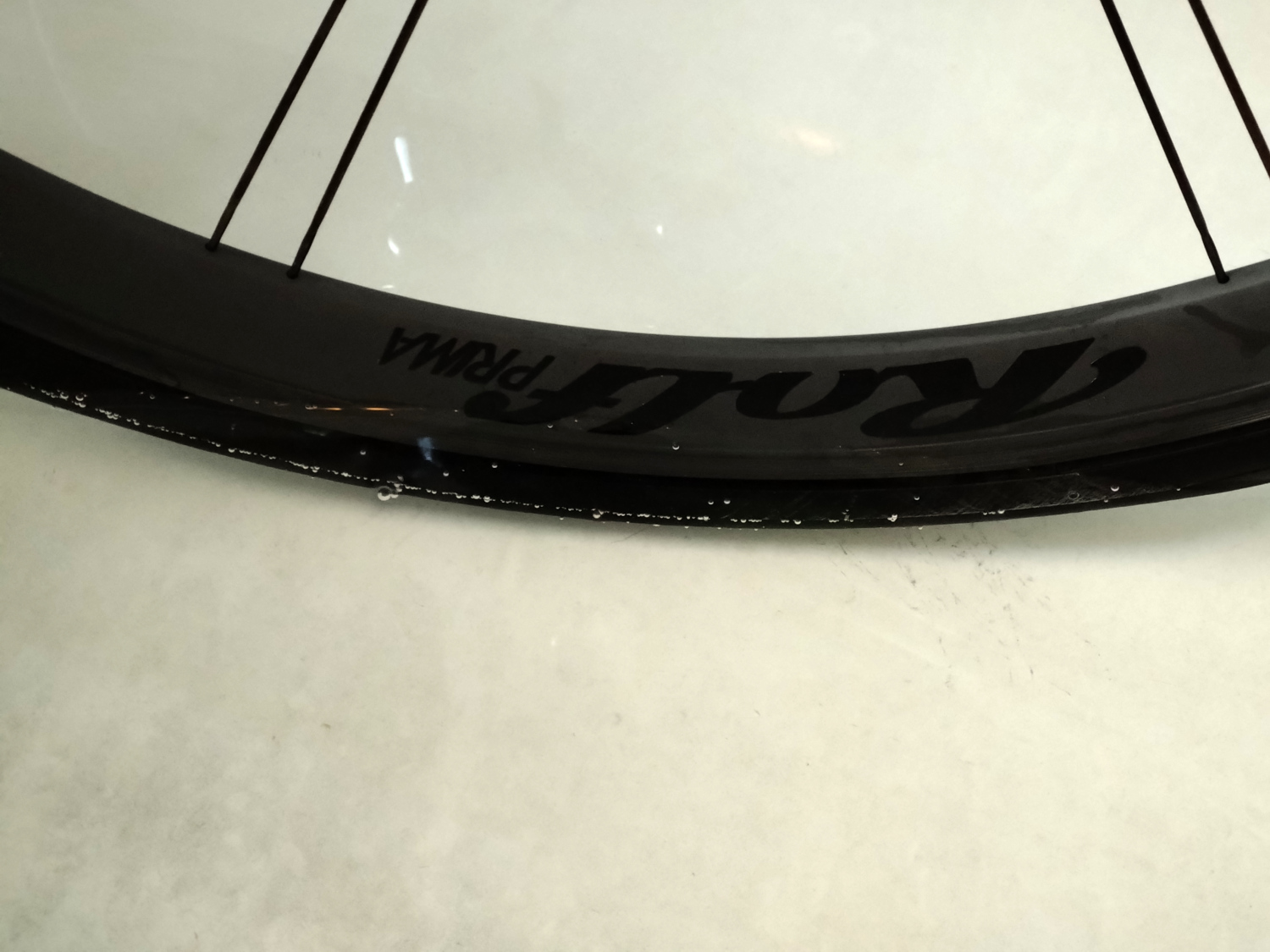 Dann also mal das Laufrad mit 6 Bar aufpumpen und in die Badewanne. Tja, und sowas habe ich tatsächlich noch nicht gesehen. Auf praktisch der gesamten rechten Reifenseite sprudelte sofort eifrig die Luft an der Kante zwischen Lauffläche und Seitenwand. Linke Seite ist absolut dicht. Sowas hatte ich weder mit Conti, Pirelli oder Schwalbe. Und warum hat die Dichtmilch da einfach nichts abgedichtet?