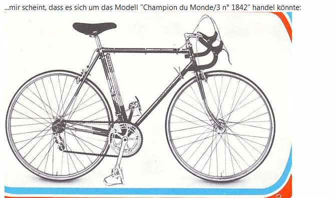 Das Bild zeigt denke ich das Super Olympic model für welches eine komplette Campa Ausstattung angegeben ist. Darunter im Text dann das Model Olympic / 3 das gleich wie Super Olympic aber mit Mafac Bremsen ist. Dann darunter, und das wäre dann möglicherweise meins, das Champion du Monde 3, wie Olympic (also mit Mafac) aber dann mit Stronglight 93 Kurbel.