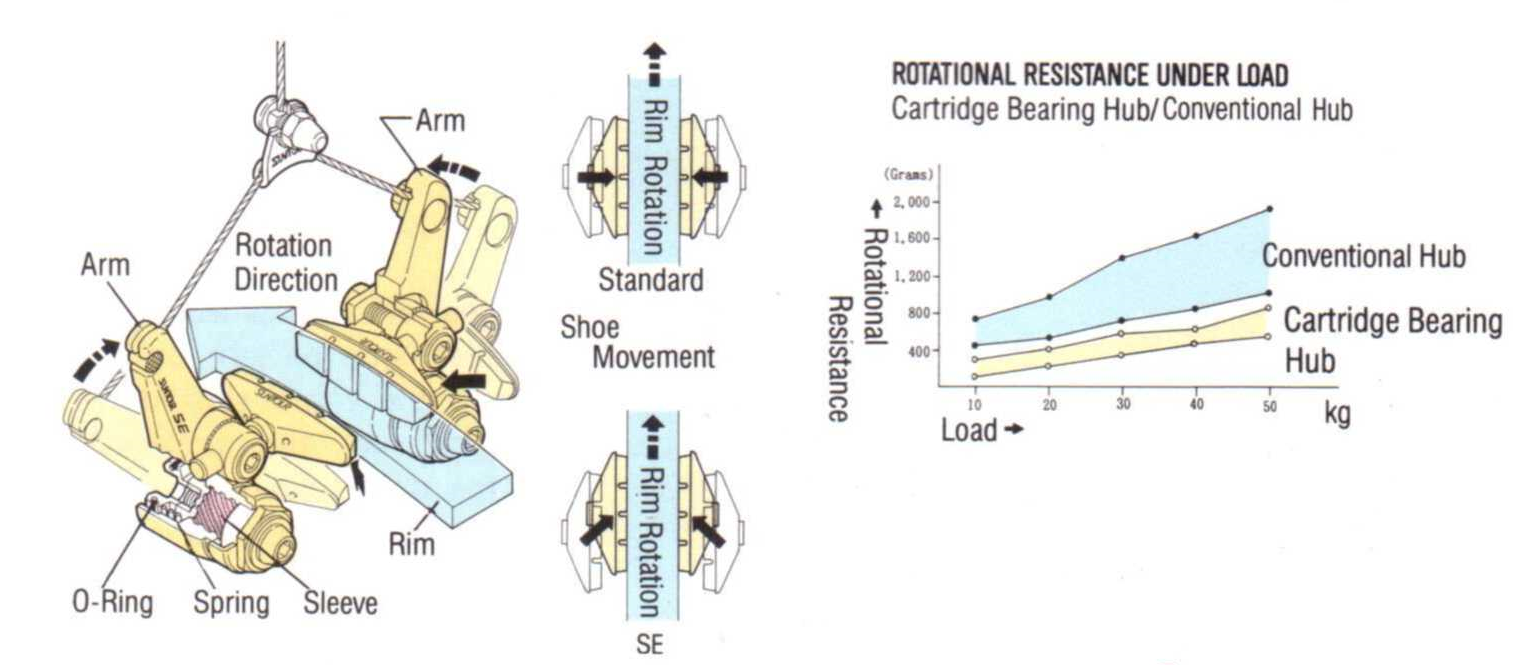 Ja, schon klar, die Funktion ist aber ähnlich, mit Spirale. Dabei ist das Prinzip der Weinmann noch eher schlüssig, mit den verschleißunabhängig immer geraden Belägen. Die SE-Bremse hat ja auch den typischen Nachteil der Cantis, dass sich die Belagposition mit dem Verschleißgrad ändert. Und warum gabs die 20 % Bremskraftverstärkung nur für hinten, wo nur ca. 20 % Bremskraft gebraucht werden?