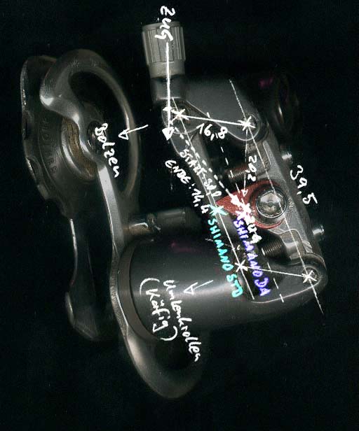 Um alte Sunnies generell Shimano-kompatibel zu machen (also außer zu DA 8-fach), muss der Anlenkpunkt des Schaltzugs ein gutes Stück weiter in Richtung Hinterrad wandern. Abknicken über die versetzte Unterlegscheibe reicht dafür nicht, es müssen ca. 3 mm mehr sein. Dafür kann man z.B. eine Kettenlasche samt einem der Bolzen mit unter die Schraube klemmen und den Bolzen als Zugumlenkung benutzen, oder sich ein passendes Teilchen selbst feilen.