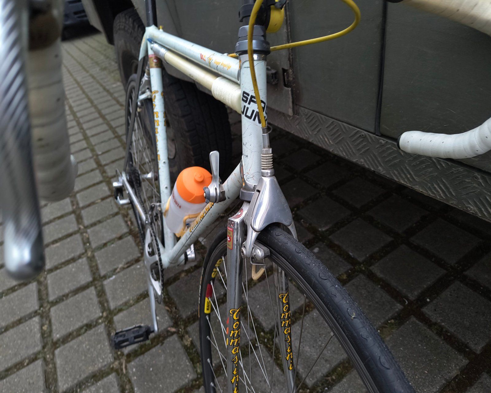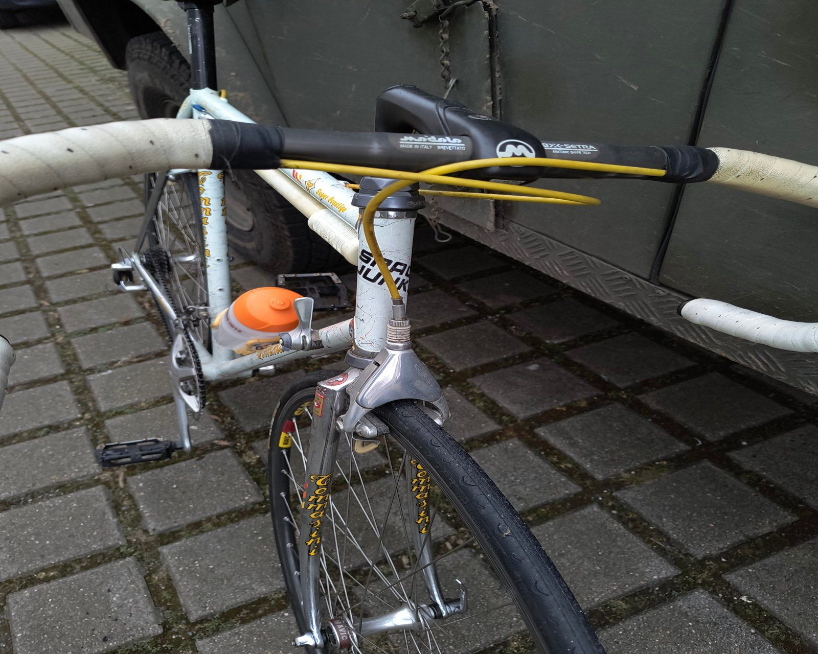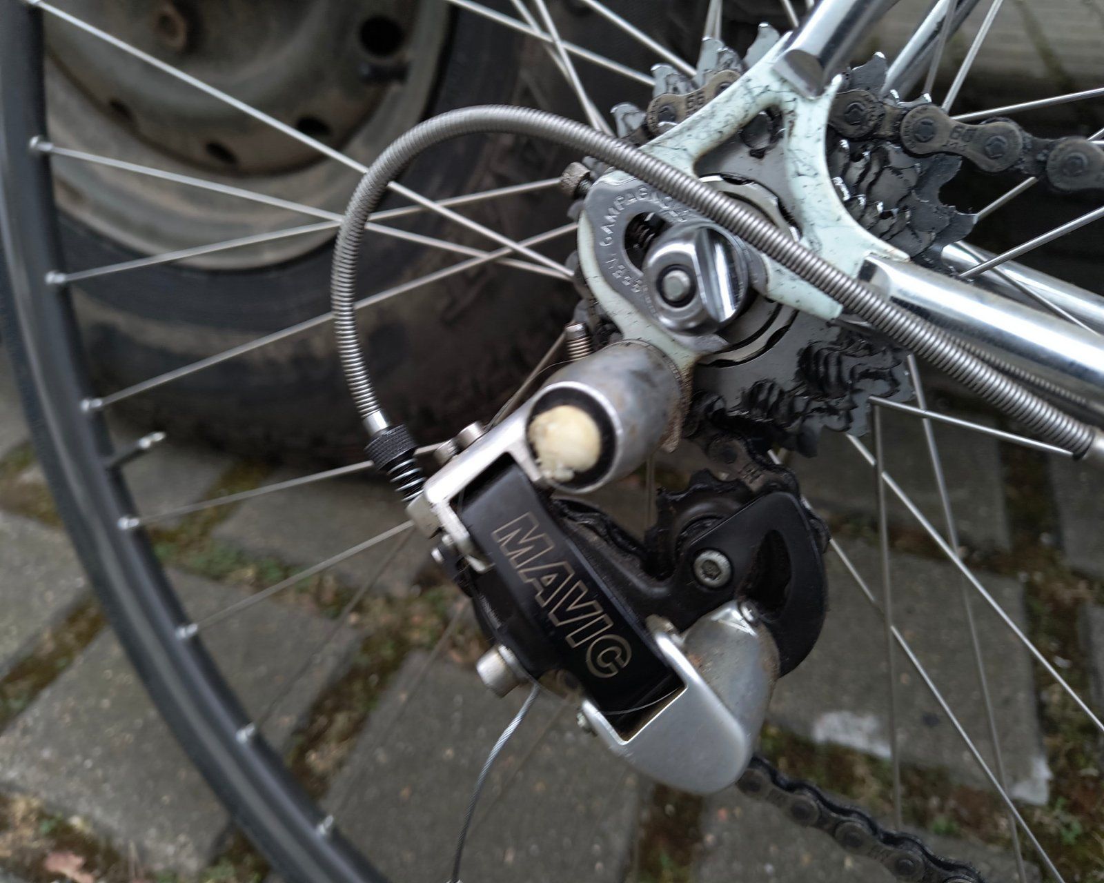 Schaltung, Kurbeln und Naben sind von MAVIC , Bremsen Campa Delta und Modolo Vorbau und Lenker. Die Sattelstütze ist eine einfache MTB, die originale war zu kurz.