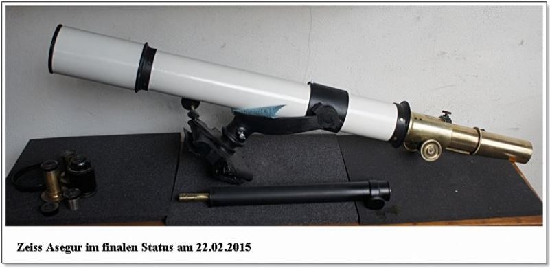 Ist zwar vom "Material" her ein ganz anderes Thema, aber zum Schluss mal 2 Bilder eines 1926er Zeiss Asegur Fernrohres, welches ich vor Jahren in 4 Monaten vom schrottigen Zustand nochmal wieder "neu erstehen" lassen konnte. Seit vielen Jahren mein Lieblings-Hobby. Restaurierung alter ( Amateur- ) Astrogerätschaften !:)