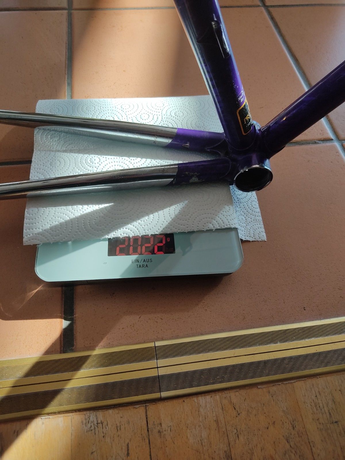 Mein Malcesine mit der gleichen Lackierung kommt bei 57,5cm C-T Rahmenhöhe mit eingepressten Shimano 600 Lagerschalen + Anlöt-Zuggegenhaltern auf 2022g