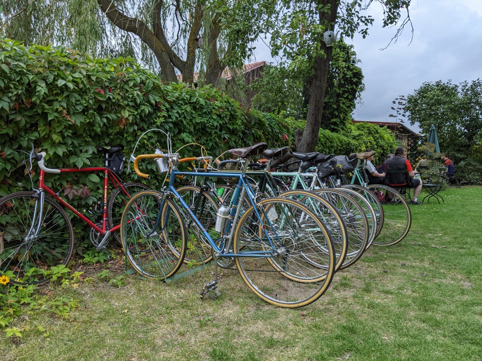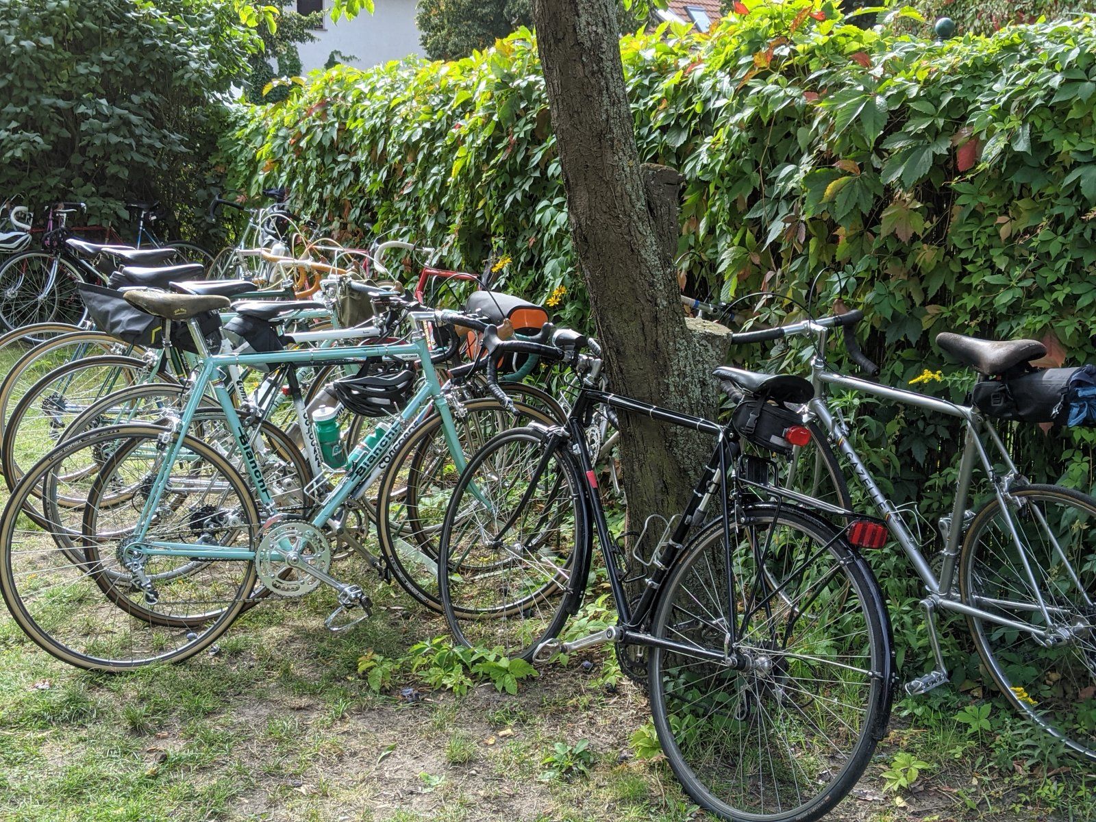 Hübscher Haufen von schönen, alten Rädern wunderbar in Szene gesetzt.