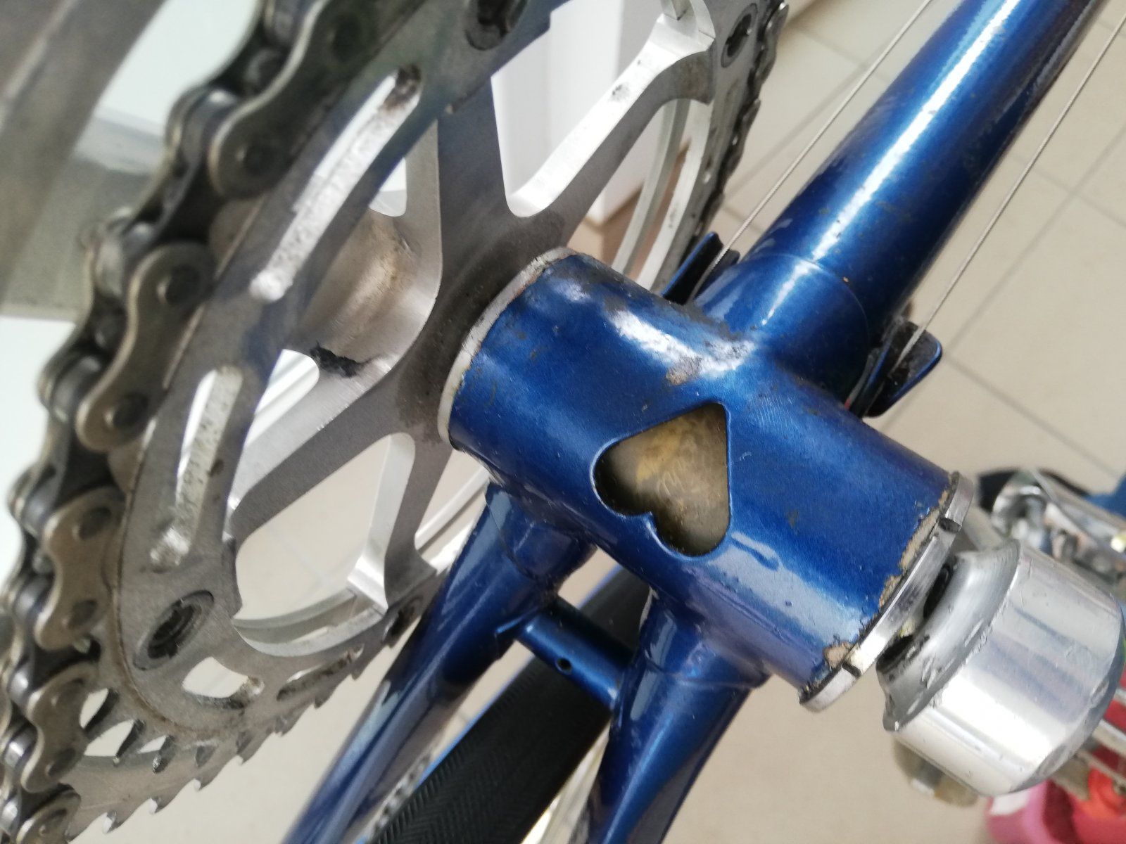 Der Rahmen lässt sich ziemlich sicher auf 73 eingrenzen. Aufgrund von panto auf der gabel und dem Herz im Tretlager. Gleichzeitig noch längere herzmuffen und älter flaschenhalter. 126 MM könnte original sein.