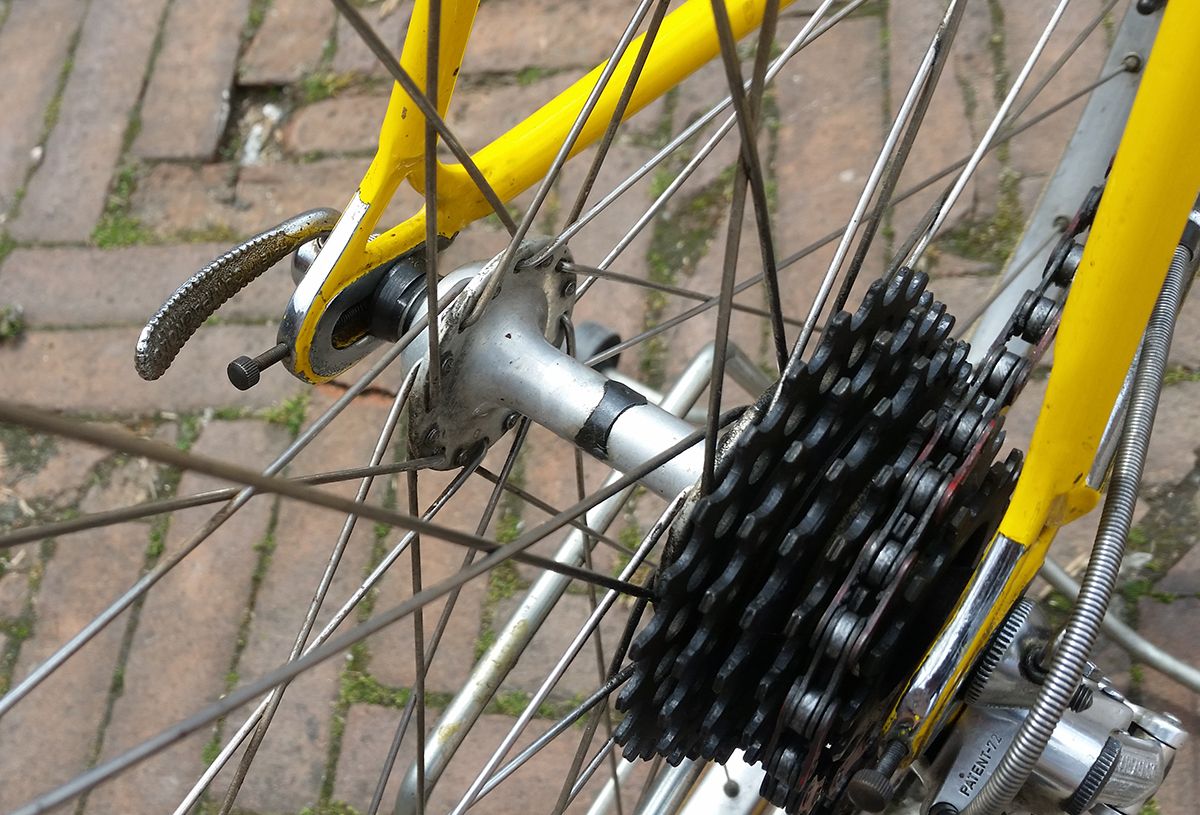 Das ist vom Erstbesitzer (dem Vater von einem meiner besten Kumpel) und hat sicher über 130.000km auf dem Buckel. Das war vom Zeitpunkt des Kaufs bis zur Neulackierung das Rad für alles. Also damit wurde täglich zur Arbeit gefahren, abends trainiert und am WE gings entweder zum Rennen oder von Ffm nach Siegen zu seiner heutigen Frau.