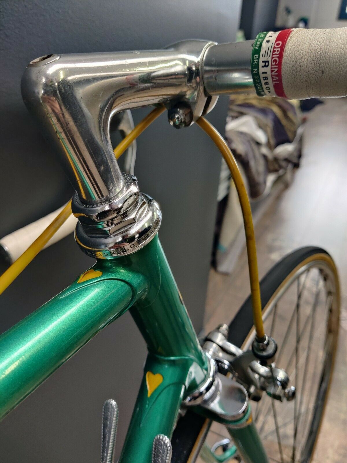Nach über einem Jahr Verhandlungen ist er nun doch bei mir gelandet. Habe vergebens auf ein De Rosa von Gilardi gehofft, aber dafür wurde ich mit originalem Lack überrascht. Steuersatz wurde testweise auch mal direkt getestet und neugefettet. Läuft. :)