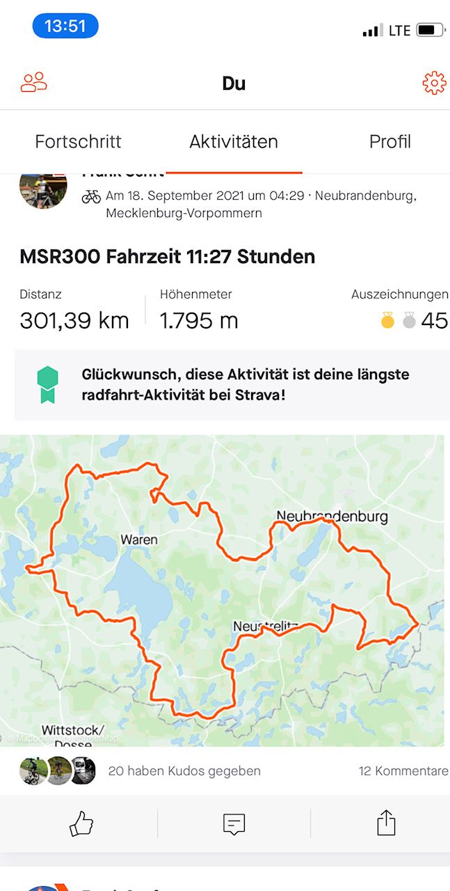 Bin heute mit ein paar "Ausfahrt-Bekannten" den St. Pauli RTF "Marathon to Hell" gefahren – 214 km RTF (mein erster RTF überhaupt, sehr gut organisiert trotz Corona-Einschränkungen) plus Hinfahrt (~25 km) und Rückfahrt. Letztere habe ich in Erinnerung dieses Freds hier so gestreckt, dass es 300 km wurden:
