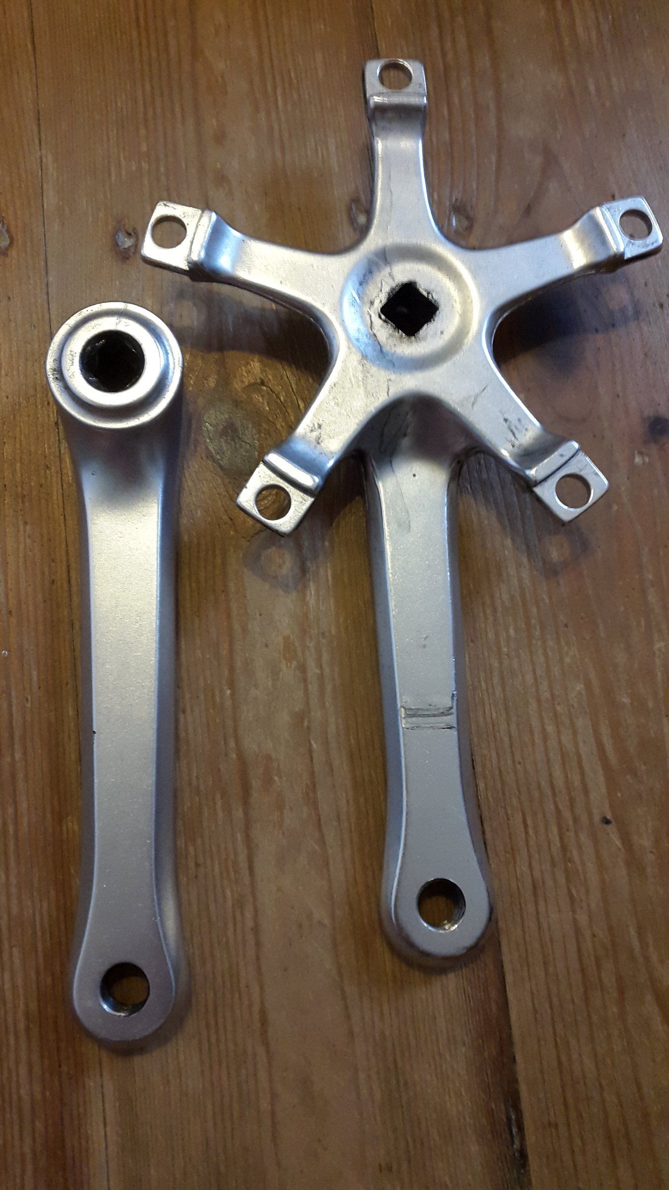Autsch, die sind dann wohl mal auf eine falsche Achse montiert worden.Die Innenseite der rechten Kurbel zeigt auch einen Riss!