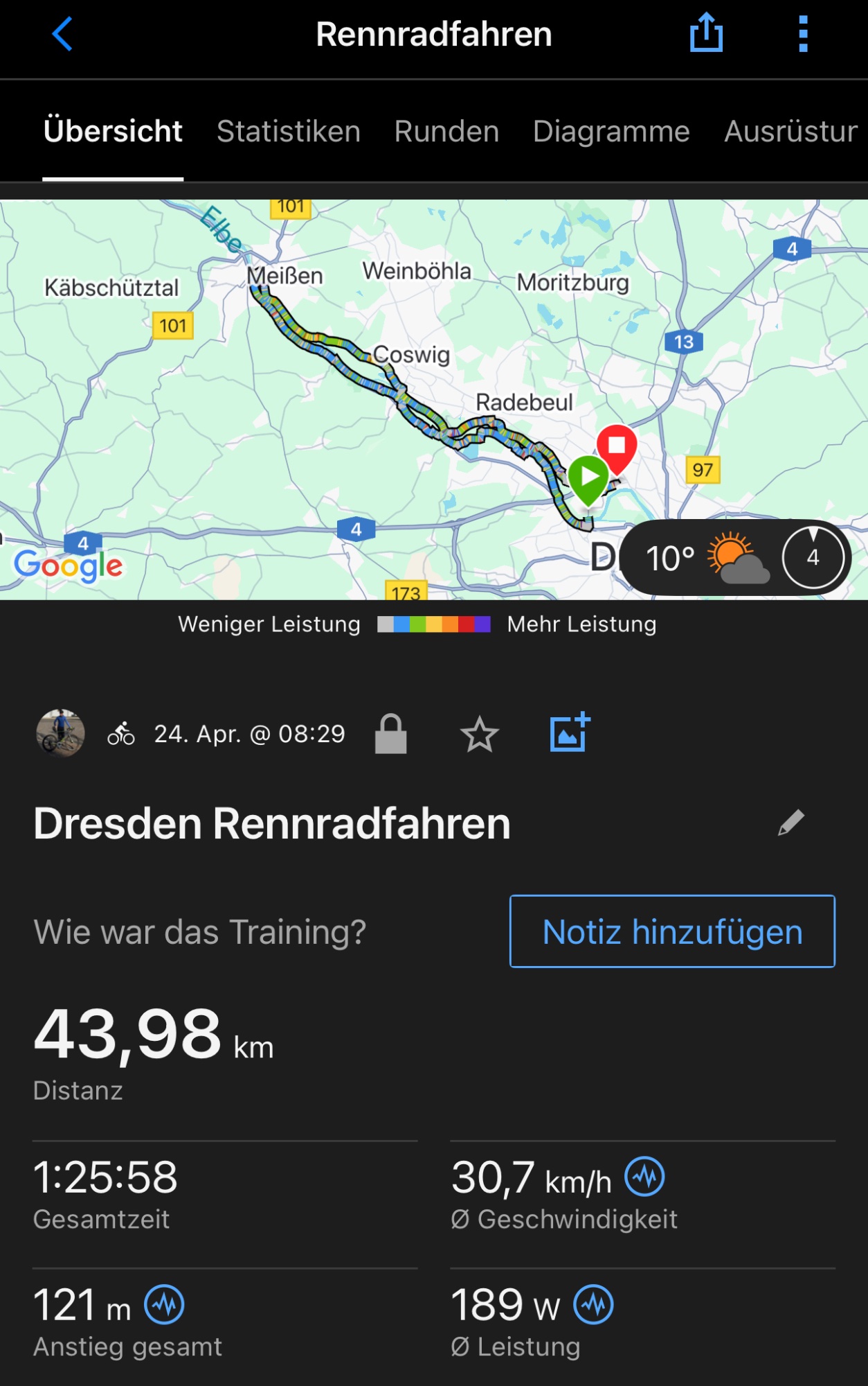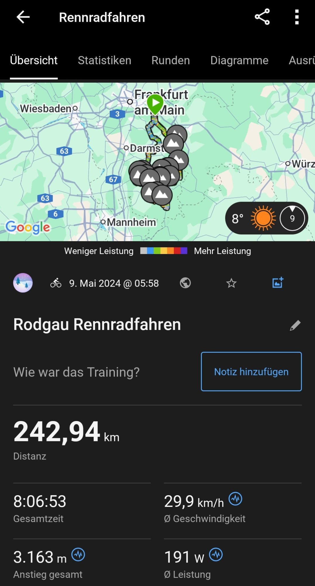 Eigentlich wollte ich locker fahren, weil ich momentan echt müde bin. Daraus ist leider nichts geworden, denn in den ersten beiden Anstiegen, habe ich mich mal so richtig abgeschossen. Als Belohnung wurde zwar meine geschätzte FTP bestätigt. Die zweite Hälfte war dafür aber wirklich zäh. Zu allem Überfluss war bei fast 50km/h auch noch einer vor mir gestürzt. Kein schöner Anblick. 🤕