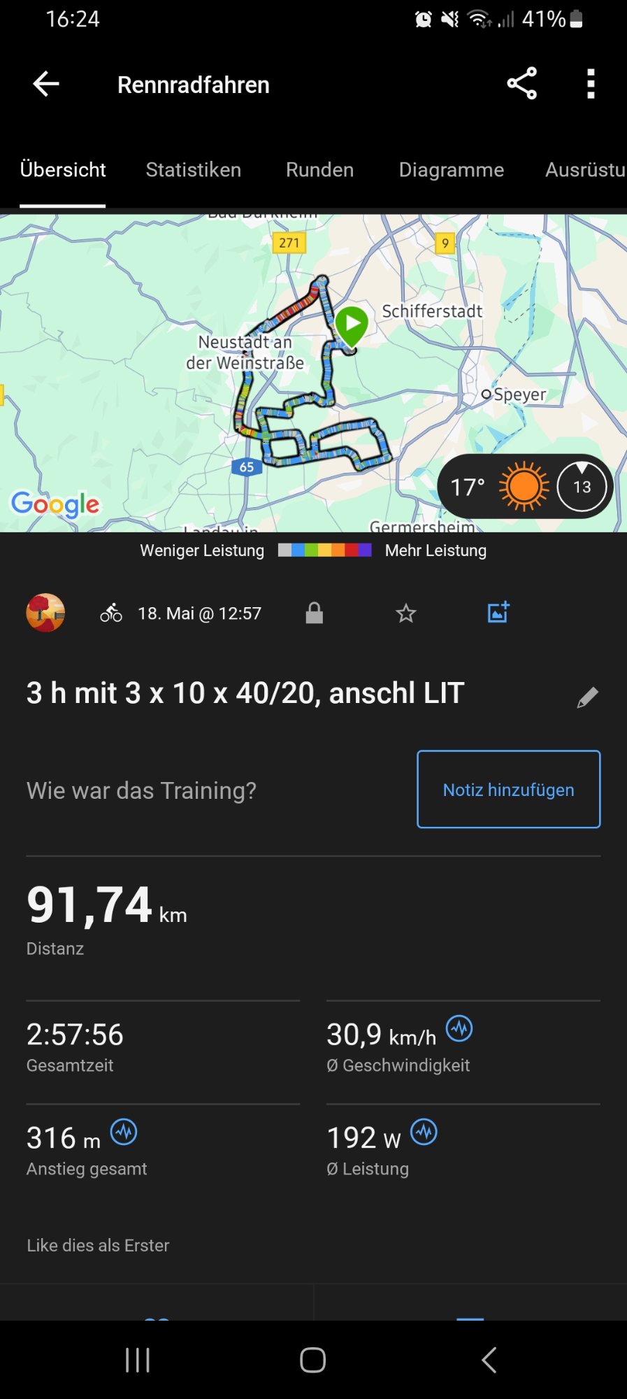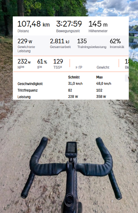 Ich fand es gar nicht so schlimm; gut - die 3 x 10 am Anfang waren schon stramm aber dann sollten LIT ca 2 h bei ca 170W sein, rausgekommen sind dann im Schnitt für die zwei Stunden 182W. Die Beine waren am Schluß etwas schwer, da war die 3 vorne aber schon erkennbar und die letzten 5 Min waren dann nur noch locker rollen.Liest sich auf jeden Fall nach Aua. Dagegen hatte ich ja heute eine Kaffeefahrt.