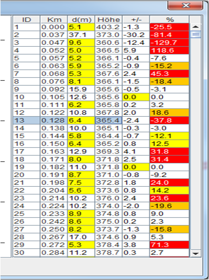 In der Tabelle siehst du die gespeicherten Daten auf den ersten 300m;)
