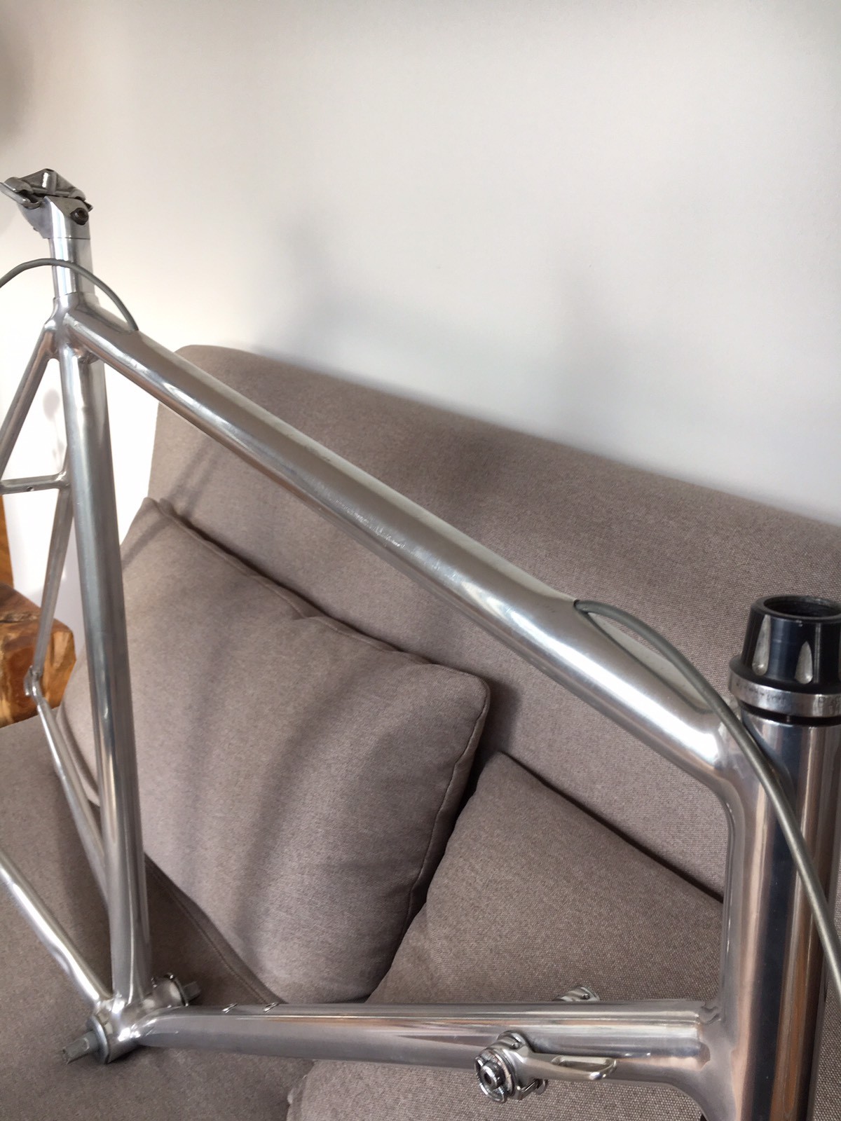 Abgenudeltes Cromovelato.....Sattel und Lenkerband wurden wohl angepinselt....Teile alle mit irgendnem Namen versehen, Klaus Centreaeif....Columbus SLX kauf ich dem Rahmen net ab, sieht aus wie Falck Crmo...zudem Gabelholme gequetscht, Hinterbau vom ständigen anlehnen zusammengedrückt...Rims komplett abgerockt und vom Eloxat befreit...