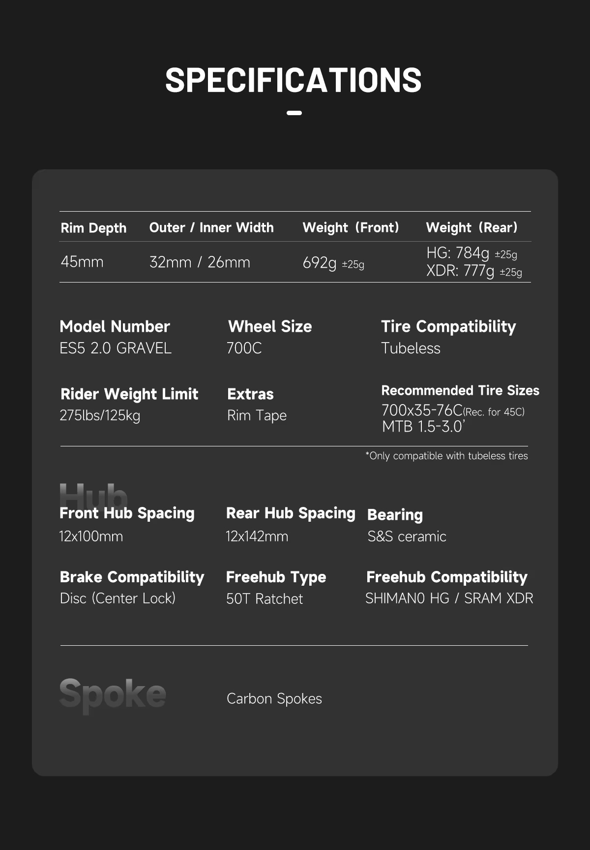 News! Es gibt einen neuen (High-End) Gravel-Laufradsatz von Elitewheels bei AliExpress: Elitewheels Gravel ES5 2.0 Preis: US $1,179.53 für den LRS, auch einzeln kaufbar. Shimano HG oder SRAM XDR Freilauf. Derzeit keine MS Option, gut möglich, dass die nachträglich über Mana beziehbar ist. 45mm Tiefe, 32mm Außenbreite, 26mm Innenweite hookless S&S Keramiklager 50T konische Ratchets (wie auch in den Aero+, Gravel Aero+ und die Drive II) nur noch 1 Jahr Garantie, statt bisher 1000 Tage auf die Felge und 1 Jahr auf die Nabe.